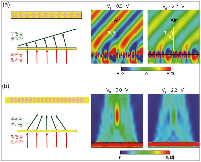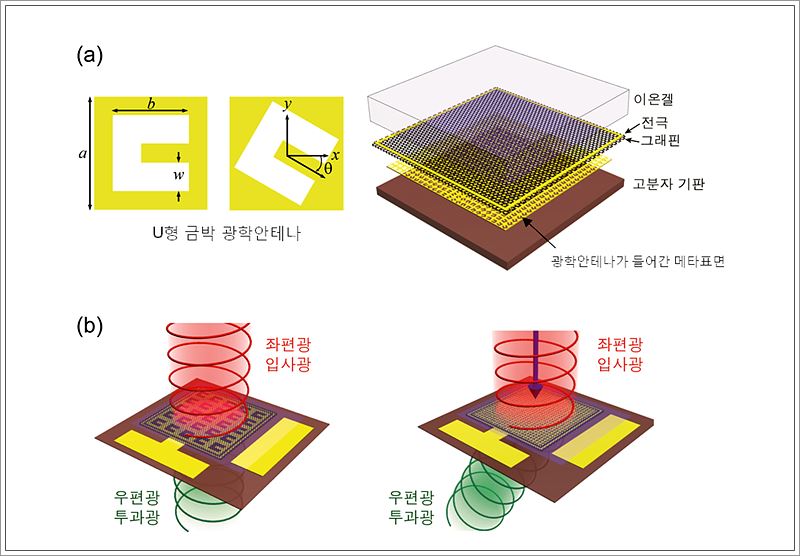상용렌즈 1000분의 1 두께, 그래핀 메타렌즈 구현- 빛의 위상 조작해 배율 조정, 조리개 기능까지 한번에 - 카메라 렌즈는 빛을 모아 상을 만들어 피사체를 재현한다. 그 과정에서 상이 뒤틀리는 수차가 생긴다. 여러 개의 볼록렌즈와 오목렌즈가 간격을 두고 빛을 투과해야 수차를 없앨 수 있다. 카메라 렌즈가 일정 두께를 유지하는 이유다. 최근 휴대폰의 두께는 얇아졌지만 고배율 등 카메라의 성능이 좋아지면서 카메라 렌즈의 돌출이 불가피해졌다. 만약 수 센치미터(㎝)의 렌즈 두께를 마이크로미터(㎛) 수준으로 줄인다면 명함 한 장 두께의 카메라 렌즈도 구현할 수 있다. 과학기술정보통신부 산하 기초과학연구원(IBS, 원장 김두철) 나노구조물리 연구단(연구단장 이영희) 김튼튼 연구위원(영사이언티스트펠로, YSF)은 KAIST 기계공학과 민범기 교수 연구진, 영국 버밍엄대학 장슈앙(Shuang Zhang) 교수 연구진과의 공동연구로 메타표면1)과 그래핀2)을 접합한 그래핀 메타렌즈를 제작했다. 기존 렌즈의 1000분의 1 수준인 25 마이크로미터 두께지만 빛의 위상을 조작해 배율을 조절하는 획기적인 방법이다. 그래핀 메타렌즈는 U형 금박 광학안테나(이하 광학안테나)가 촘촘하게 배열된 메타표면으로 제작됐다. 광학안테나가 빛의 위상을 제어해 좌편광(우편광)된 빛을 우편광(좌편광)으로 전환시킨다. 광학안테나의 배열을 바꾸면 빛을 원하는 방향으로 굴절시키거나, 한 곳으로 모을 수 있다. 빛의 위상을 개별적으로 조작해 렌즈의 두께와는 무관하게 배율 조정도 가능하다. 연구진이 이번에 구현한 그래핀 메타렌즈는 테라파3)의 주파수를 이용하도록 제작됐다. 만약 광학안테나의 크기를 줄인다면 가시광선4)주파수에 적합하도록 제작할 수 있다. 이를 이용하면 카메라 렌즈의 크기가 혁신적으로 줄어든다. 연구진은 전압을 조절해 그래핀 메타렌즈를 투과해 모인 빛의 세기를 제어하는 데에도 성공했다. 빛의 세기를 조절하는 조리개5)역할을 하는 것은 0.2㎚의 얇은 그래핀이다. 평상시에는 투명하지만 흐르는 전압의 크기가 커질수록 불투명해지는 특성을 이용했다. 김튼튼 연구위원은 “상용 테라파 렌즈의 두께가 수 센치미터인 반면, 25 마이크로미터 두께의 그래핀 메타렌즈를 실제로 구현했다. 그래핀과 결합시켜 비교적 간단한 전압조절로 집속된 빛의 세기를 효과적으로 제어할 수 있음을 보여 초소형 광학기기에 응용이 기대된다”고 연구 의의를 밝혔다. 이번 연구성과는 광학분야 전문학술지 '어드밴스드 옵티컬 머티리얼즈(Advanced Optical Materials)'에 11월 20일 온라인 게재되었다. 그림설명
