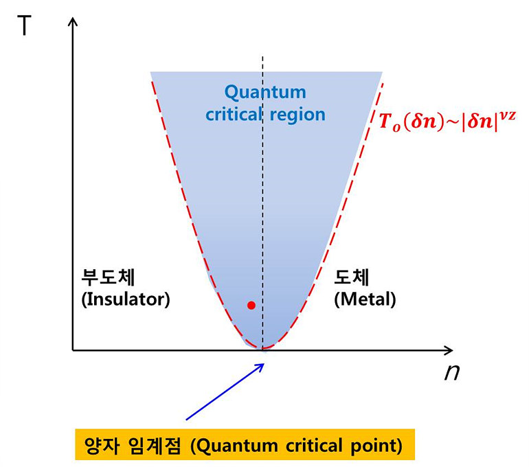 ▲ [그림 1] 온도와 수송자 밀도에 대한 도체-부도체 상전이 현상위 그림은 양자 상전이 (quantum phase transition)로서의 도체-부도체 상전이 (metal-insulator transition, MIT)를 보여주고 있다. 즉 상전이가 온도와 상관없이 수송자 밀도가 바뀌면서, 어느 특정한 임계값을 지날 때 MIT 가 유도되는 현상이다. 다시 말하면, T=0 일 때 단지 수송자 밀도를 바꿈으로써 양자 기저 상태 (quantum ground state)들 간의 상전이가 일어나는데, 상전이가 일어나는 순간의 수송자 밀도를 양자 임계점 (quantum critical point)이라고 부른다. 보통 실험은 유한한 온도에서 수행되므로 상전이가 양자 상전이라는 것을 보이기 위해서는 특별한 증거가 필요한데, 위 그림에서 보는 것처럼 온도가 올라갈수록 양자 임계점의 특징이 나타나는 영역, 즉 양자요동이 열요동 보다 중요한 영역이 넓게 나타난다. 이 영역에서는 온도에 대한 전기 전도도를 각 서로 다른 수송자 밀도들에 대하여 일정 온도 변수 (T0)들로 온도를 다시 재 규격화 하면 (눈금 맞춤, scaling), 각 도체 영역과 부도체 영역에서 모든 점들이 하나의 연결된 선상에 놓이게 된다. 이럴 때 온도변수들은 수송자 밀도에 대하여 거듭곱 법칙 (power law)을 따르게 되고, 이때의 지수 (위 그림에서 νz)가 양자 상전이를 특징짓는데 중요한 요소가 된다. MIT 현상을 양자 상전이가 아닌 다른 종류의 상전이로 보는 견해들도 있으며, 아직까지 논쟁거리로 남아 있다.