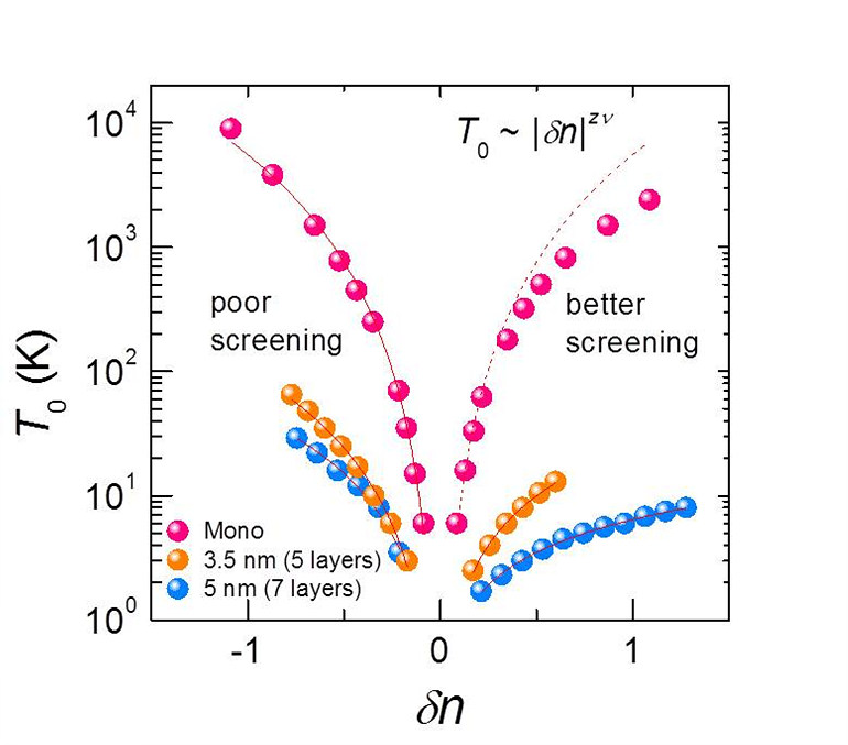 ▲ [그림2] 여러 두께에 대한 눈금 맞춤 변수 (scaling parameter) 의 부도체 (δn < 0) 와 도체 (δn > 0) 영역에서의 변화위 그림은 여러 두께의 MoS2에 대해서 앞에서 언급한 눈금 맞춤을 통하여 각각 얻어진 눈금 맞춤 변수 (T0)를 상대적인 수송자 밀도에 대해서 표시한 것이다. 각각 눈금 맞춤 변수가 거듭곱 법칙을 잘 따르는 특성은 이 물질에서의 MIT 가 양자 상변이일 가능성이 높다는 것을 말한다. 한 가지 특이한 점은 두께가 두꺼울수록 임계점을 중심으로 대칭적이지 않다는 것인데, 이 현상은 전통적인 이론으로는 잘 설명이 되지 않는다. 본 연구진은 도체에서의 자유 수송자에 의한 차폐효과 (screening effect), 즉 부도체와의 비대칭적인 차폐효과에서 그 원인을 찾았다. 단층으로 갈수록 그 차이가 줄어들어 점점 대칭적으로 변하는데, 이는 복층에서와는 달리 단층에서는 MIT 가 상호작용에 의해서가 아닌 불순물에 의해서 유도가 되기 때문으로 해석된다. 이러한 두께에 대한 불순물과 수송자간 상호작용의 특성변화 그리고 차폐효과와 같은 물리적 환경의 조절 용이성 등은 MIT 의 메커니즘을 밝히는데 있어서 TMD 물질이 기존의 전통적인 물질 시스템의 한계를 뛰어 넘어, 아주 유용한 시스템으로 쓰일 수 있는 요인들이 될 것으로 기대된다.