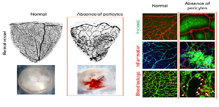 Loss of Pericytes Deteriorates Retinal Environment- Discovering the role of pericytes in the blood-retinal barrier suggesting pathogenetic insights into diabetic retinopathy - Inside the eye, at the interface between blood vessels and the retina, lies a boundary that prevents harmful substances present in the blood from entering the retina. Researchers at the Center for Vascular Research, within the Institute for Basic Science (IBS) are studying the role of cells called pericytes, which protectively wrap the retinal vessels building up this blood-retinal barrier. This new study published in Nature Communications, revealed how the loss of pericytes aggravates the retinal environment and function in a mouse experimental model. These findings could contribute to the development of new therapies for blindness-causing diseases, such as diabetic eye disease (diabetic retinopathy). Diabetic retinopathy, one of the major complications of diabetes, is considered a leading cause of blindness in adults. The loss of pericyte at the blood-retinal barrier is a hallmark of this disease, but its leading causes and exact roles are still unclear. "We still do not know how pericytes influence the development of diabetic retinopathy. Is the loss of pericytes the direct cause of this disease? Or the aftermath of other damages of the blood-retinal barrier? Or both of them? Knowing this information can help us tackle the disease," explains KOH Gou Young, corresponding author of this study. Diabetic retinopathy can affect patients who have had diabetes for around 10-20 years. On the other hand, studying this disease on mouse experimental models is difficult because of their short lifespan. IBS scientists produced a new mouse model to study diabetic retinopathy and observed that young mice deprived of the growth factor responsible for proper attachment of pericytes to retinal vessels had severe retinal vascular leakage, impaired vascular network and visual loss similar to diabetic retinopathy. The research team confirmed that at the heart of these symptoms is the lack of pericytes at the blood-retinal barrier.
