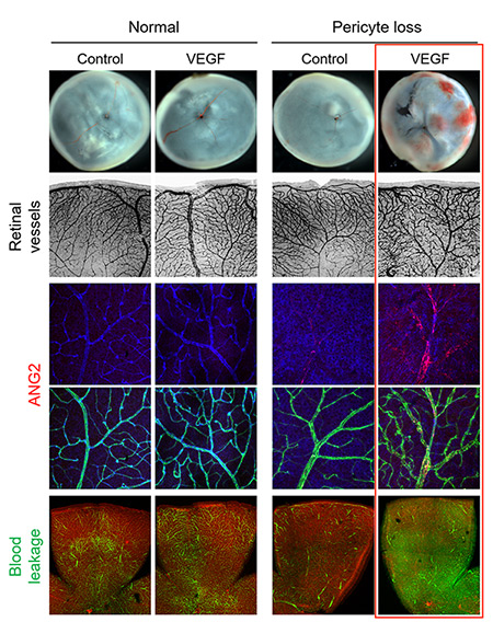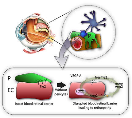 IBS scientists then made a surprising observation: while young mice deprived of pericytes experienced such harmful effects, adult mice did not suffer from the same problems. Unexpectedly, when the scientists removed the pericytes from the retina of adult mice, the vessels kept resistant to vascular leakage. One thing the scientists could observe though, is that these adult healthy-looking retinas without pericytes were more sensitive to the vascular endothelial growth factor A (VEGF-A). VEGF-A causes the activation of FOXO1 and Ang2, leading to lesions that resembles diabetic retinopathy. "The role of pericytes is still not fully understood, however these experiments show that once the blood-retinal barrier around the vessels is well established, as in adulthood, pericytes dropout is not the only cause of diabetic retinopathy. It is instead an aggravating factor that essentially accelerates the progression of the disease, sensitizes it to VEGF-A and further destabilizes retinal blood vessels," explains Koh. "We expect that the activation of Tie2, together with Ang2 inhibition could be used therapeutically to treat retinopathy."