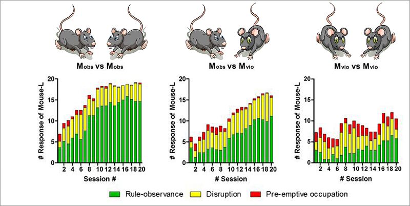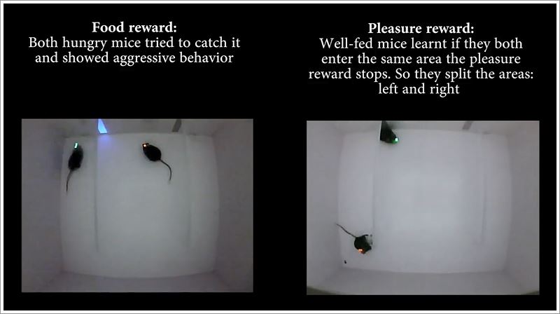 “Beyond this, another rule is tolerance. If a mouse violates the rule, the other mouse has the choice of retaliate immediately, or tolerate and keep on observing the rule. Tit for tat brings a disruption of the system, while tolerance to partner’s mistakes allows the system to continue, and as a result both mice receive a long-term benefit,” explains the professor. “This is called Bourgeois strategy in psychology. It limits aggression and is better for the long-term.” Food reward for hungry mice was also tested for comparison. In this case, mice are more impulsive and more aggressive, even after the end of the experiment. Mice generally establish hierarchy, and aggression was observed in 57% of the sessions. On the contrary, aggression happened in only 8% of the WBS experiment.