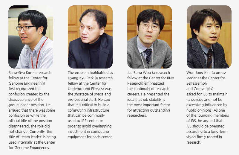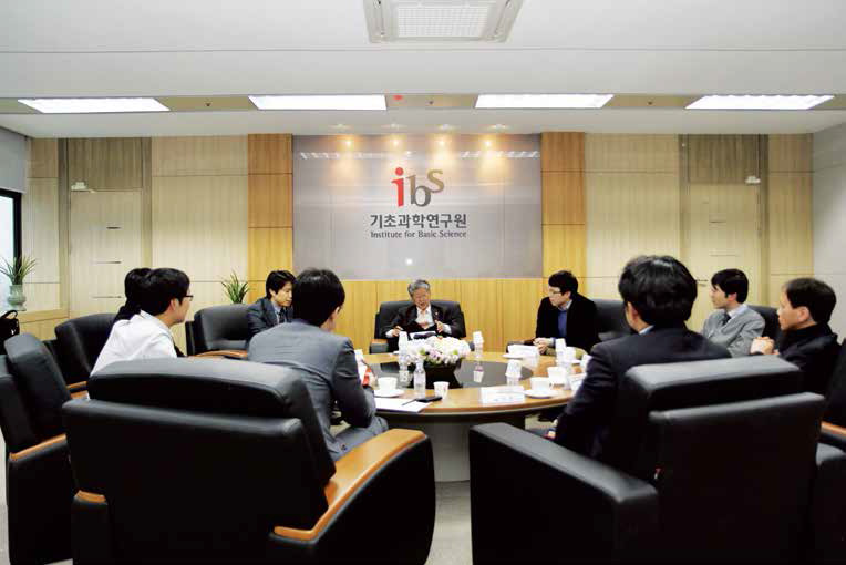 The first issue addressed during the conversation was group leaders. The group leader system was one of the core structural components of IBS. However, disputes over the selection of group leaders continued since its inauguration. These disputes were due to the suspicion that group leaders were selected based more on academic or social networks rather than on the candidates’ competencies because they were appointed or recommended directly by IBS directors. This criticism, however, was somewhat unfair to IBS because it had prepared its own evaluation system in relation to the selection of group leaders. After all, IBS had decided to improve the group leader system.