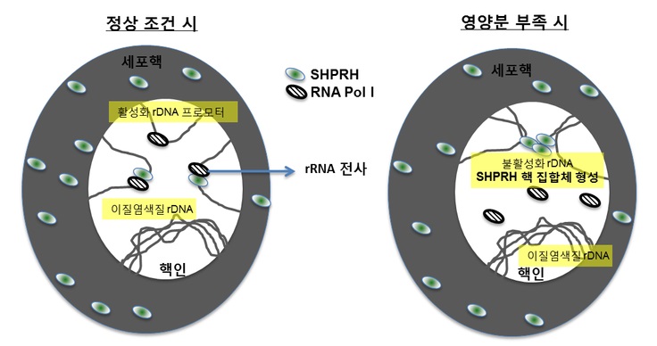 노화 막는 세포 다이어트, DNA 복구 단백질(SHPRH)이 열쇠- IBS, SHPRH단백질이 리보솜의 단백질 생산 조절하는 과정 밝혀 - 절식요법, 간헐적 단식 등이 주는 건강 효과는 익히 알려져 있다. 체중 감량을 위해 과도하게 단식하는 것은 몸을 해치겠지만, 적절한 단식이나 소식은 오히려 건강에 좋다는 연구 결과들이 알려지면서 건강 다이어트의 열풍이 불었다. 그런데, 왜 단식하거나 적게 먹으면 건강해지는 걸까? 그 비밀은 세포의 엠토(mTOR) 메커니즘에 있다. 기존 연구에서 세포는 영양분이 부족한 경우, 엠토라는 인산화 효소를 이용해 단백질 생산을 줄이는 다이어트를 한다고 알려져 있다. 세포의 다이어트로, 우리 몸은 노화나 암과 같은 질병이 진행되지 않도록 대사를 조절할 수 있는 것이다. 실제로 암과 같은 질병에서 엠토 메커니즘의 조절이 제대로 일어나지 않는 것이 발견됐다. 즉, 세포의 단백질 다이어트 덕분에 우리 몸의 건강이 제대로 유지될 수 있다고 볼 수 있다. 엠토 메커니즘은 단백질 합성 공장인 리보솜의 DNA 전사를 억제하는 방식으로 이루어진다. 그러나 이 메커니즘은 항노화나 항암 효과를 갖는 것으로 알려져 있을 뿐, 여기에 작용하는 단백질이나 구체적인 리보솜 DNA의 전사 억제메커니즘이 정확하게 알려지지 않았다. 특히 리보솜 DNA를 RNA로 전사하는 RNA 중합효소가 어떻게 전사 대상이 되는 DNA를 인식하는지에 대해서도 알려진 바가 없었다. 이에 따라 IBS 유전체 항상성 연구단 명경재 단장 연구팀은 RNA 중합효소가 DNA를 인식하도록 하는 데 SHPRH라는 단백질이 작용함을 새롭게 밝혔다. 세포 내 리보솜이 합성되는 곳인 핵인(nucleolus)을 염색해 SHPRH 단백질이 이곳에 위치할 수 있음을 확인하였으며, 추가 실험으로 이 단백질이 RNA 중합효소가 결합하는 리보솜 DNA의 프로모터 부위에 많이 존재하는 것을 관찰했다. 또한, 엠토 효소를 억제하는 물질을 세포에 처리하자, DNA 프로모터에 결합한 SHPRH 단백질의 양이 감소하는 것을 확인했다. 종합하면, SHPRH 단백질은 엠토 효소를 이용해 DNA의 프로모터 부위에 결합하고, RNA 중합효소 복합체와 직접 결합, RNA 중합효소가 DNA를 인식하도록 도와 리보솜 DNA의 전사를 조절한다. 염색체는 DNA와 히스톤 단백질로 구성되어 있는데, 이들의 변형은 DNA 전사 여부를 결정한다. SHPRH 단백질은 RNA 중합효소 복합체에 직접 결합하고 엠토를 이용하여 히스톤 단백질(특히 히스톤 단백질 중 하나인 H3)에 결합함으로써 리보솜 DNA의 전사를 조절한다는 것이 이 연구를 통해 밝혀진 것이다. 또한, 정상 조건의 세포와 영양분이 부족한 세포의 SHPRH 단백질 분포 양상을 비교한 결과, 영양분이 충분한 경우에는 SHPRH 단백질이 리보솜 DNA 프로모터에 포진해있는 데 반해 영양분이 부족한 경우에는 서로 응집해 집합체를 형성하는 것을 관찰했다(그림 2 참조). 이렇게 형성된 SHPRH 단백질 집합체는 RNA 중합효소와 결합할 수 없어 리보솜 DNA의 전사과정이 억제된다. SHPRH 단백질은 세포의 영양 상태와 같은 외부환경의 변화에 따라 세포 내 분포도를 바꿔 단백질 생산을 조절한다고 볼 수 있다.