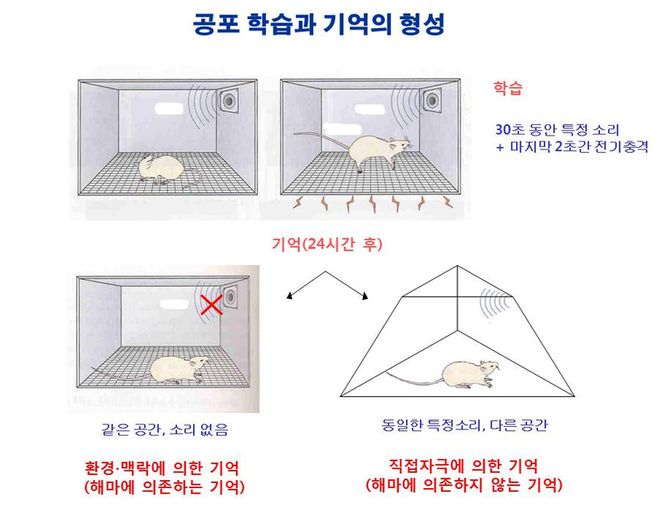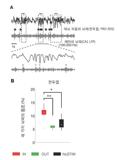 최근 '첫 키스만 50번째'라는 영화가 영화관에서 재개봉됐다. 이 영화 속 주인공은 자동차 사고로 뇌 손상을 입어 하루 단위의 기억은 할 수 있지만, 밤새 기억들을 모두 잊고 다음 날 다시 백지 상태가 된다. 오늘 일어난 일을 내일이 되면 기억하지 못하는 것이다. 때문에 주인공은 연인 사이인 남성과 매일 초면이 되는 셈이지만, 남성의 사랑과 배려로 둘은 사랑을 이어나간다. 물론 이 영화의 주인공이 앓는 기억상실증 패턴은 작가가 상상으로 꾸며낸 것이다. 그러나 주인공이 하루 이상의 장기기억에 실패하는 것은 분명하다. 보고 듣고 느끼는 감각을 통해 20-30초간 형성되는 단기기억과 달리, 우리가 대체로 기억하는 몇 분 전 상황에서 몇 십 년 전의 일들은 모두 장기기억이다. 장기기억은 매일 겪는 경험이 되고, 추억으로 자리 잡으며, 결국 나 자신의 정체성을 이루기 때문에 매우 중요하다. 장기기억은 뇌의 해마부위에서 담당하는데, 이는 수면과도 무관하지 않다. 학습을 한 후 잠을 자는 동안 학습에 대한 기억이 강화된다는 연구가 있다. 시험 전 날 밤을 새는 것보다 몇 시간이라도 잠을 자는 것이 오히려 시험을 더 잘 볼 수 있다는 이야기는 과학적 근거가 있는 것이다. 간뇌의 시상(thalamus) 부위에서 나오는 뇌파인 수면방추파(thalamic spindles)는 숙면을 도울 뿐만 아니라 기억 형성에도 관여한다고 알려져 있기 때문이다. 그러나 수면방추파와 장기기억 간의 정확한 인과관계는 밝혀진 바가 없었다. 뇌에서는 여러 주파수를 갖는 다양한 종류의 뇌파가 발생하는데, 학습과 기억에 관여하는 것으로 알려진 종류로는 수면방추파 외에 대뇌 피질에서 발생하는 느린 주파수의 뇌파인 서파(slow oscillations)와 해마 부위에서 발생하는 SWR파(Sharp wave ripples)가 있다. 연구진은 수면 방추파가 다른 두 종류의 뇌파와 상호작용하여 기억 형성에 작용할 것으로 보았다. 이에 따라 빛을 받으면 나트륨 이온 채널을 여는 채널로돕신을 생쥐 간뇌의 시상 신경세포에 발현, 여기에 꽂은 전극을 통해 빛으로 수면 방추파 발생을 유도하는 광유전학적 방법을 이용했다. 우선, 생쥐 실험은 실험 대상인 생쥐들에게 특정 공간에서 30초 동안 특정 주파수의 소리를 들려주다가 마지막 2초간 전기 충격을 가하는 것으로 시작한다. 생쥐들은 공포스러운 경험 후 각각 소리와 전기충격, 특정 공간과 전기충격이 연관된다는 기억을 갖게 되는데, 이를 조건화(Conditioning) 과정이라 한다. 그런 다음, 수면을 유도해 대뇌 피질의 서파 발생 시기에 따른 세 가지 다른 처리를 한다. 한 생쥐에게는 대뇌 피질의 서파 발생 시기에 맞춰(in-phase) 빛으로 수면방추파를 유도하고, 다른 생쥐에게는 대뇌 피질의 서파 발생 시기와 상관없이 다른 시점(out-of-phase)에 무작위로 수면방추파를 유도한다. 그리고 또 다른 생쥐에게는 간뇌 시상에 빛을 비추지 않아 수면 방추파 발생을 인위적으로 유도하지 않는다. 24시간이 지난 뒤, 이 세 종류의 생쥐를 두 가지 상황에 각각 배치한다. 하루 전 공포를 느꼈던 똑같은 공간에 특정 소리가 없는 상황과 전날과 전혀 다른 공간이지만 특정 소리가 들리는 상황이다. 공포를 느낄 때 바짝 얼게 되는 생쥐의 행동을 관찰한 결과, 같은 공간에 특정 소리가 없는 상황에 처한 세 종류의 생쥐 중, 대뇌피질의 서파 발생 시기에 맞춰 수면방추파 유도 처리를 한 생쥐가 가장 공포에 대한 기억을 잘하는 것으로 나타났다. 반면, 공포를 느꼈던 공간과 전혀 다른 공간에 들어가 동일한 소릴를 들은 세 종류의 생쥐들은 공포스러웠던 기억을 떠올리는 정도에 차이가 없었다.