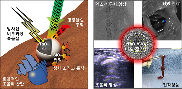 조영제·지혈제 두 가지 역할 '나노 접착제'개발- 기존 고분자 접착제 대비 독성 줄이고, 성능 높여 - 최근 초음파, 엑스선(X-Ray) 투시, 컴퓨터 단층촬영(Computed Tomography, CT) 등의 영상을 활용한 첨단 시술1)이 늘고 있다. 심장 등의 막힌 혈관을 넓히는 스텐트 시술과 간암 치료용 간동맥 항암 색전술이 대표적이다. 시술에는 조영제와 지혈제가 반드시 수반된다. 체내 병변이 조영제와 결합해야 영상 식별이 가능하다. 지혈제는 시술 시 발생하는 출혈을 막아 시술 시간을 단축하고, 시술 후 환자의 회복 속도를 높인다. 미래창조과학부(장관 유영민) 산하 기초과학연구원(원장 김두철) 나노입자 연구단 현택환 단장과 서울대학교병원 영상의학과 김효철 교수, 국민대학교 신소재공학부 이노현 교수 연구진은 '나노 접착제'를 개발했다. 현재 쓰이는 합성 고분자 접착제2)보다 독성이 현저히 낮고, 미량으로도 상처부위를 완벽하게 봉합할 수 있는 물질이다. 제작법을 응용해 다양한 물질로 나노입자 접착제를 만들면 활용 범위를 손상 조직 접합, 외상 후 출혈 지혈 등으로 넓힐 수 있다. 나노 접착제는 두 가지 물질을 결합해 만든다. 소량으로도 전자파, 음파 등에 산란 효과가 탁월한 탄탈륨옥사이드3)에 접착성이 우수한 실리카 나노입자4)를 입히면 생체적합도가 높은 나노 접착제가 만들어진다.