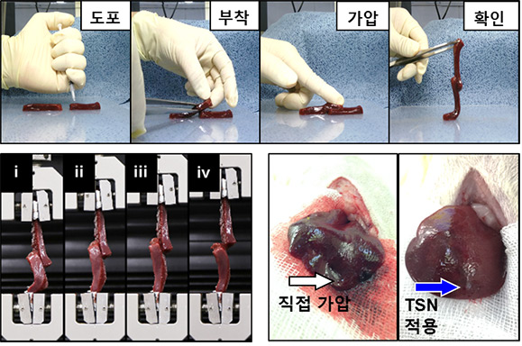 시술에 앞서 나노 접착제를 병변부위에 미리 주입하면, 병면 조직을 영상 장비로 확인해 효과적으로 치료할 수 있다. 실리카 나노입자의 강한 접착성은 시술 시 생기는 상처를 쉽고 빠르게 지혈시킨다.5) 합성고분자 접착제보다 세포 독성은 월등히 낮아, 시술 후 발생할 수 있는 염증 빈도가 현저히 줄어든다. 연구진은 동물실험으로 효과를 확인했다. 토끼를 대상으로 혈관이 많고 지혈이 어려운 간 조직에 상처를 가하고 나노 접착제를 동반한 시술에 성공했다. 또한 폐암에 걸린 실험쥐의 암 조직을 표지해 방사선 치료와 선택적 제거수술의 가능성을 확인했다.
