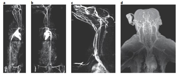 차세대 산화철 나노입자 MRI 조영제 영장류 실험 성공- 기존 MRI 조영제의 부작용없고 뇌 혈관 및 뇌 관류 조영효과 뛰어나 - 자기공명영상법(Magnetic Resonance Imaging, 이하 MRI)은 자석으로 구성된 장치에서 인체에 고주파를 쏘아 인체에서 신호가 발산되면 이를 되받아서 디지털 정보로 변환하여 영상화하는 장치이다. 방사선을 사용하는 다른 영상 진단 장비에 비하여 인체에 해가 없으면서 선명한 체내 영상을 얻을 수 있어 현재 가장 널리 사용되고 있는 영상 진단 장비 중 하나이다. 각 조직 및 혈관을 더욱 명확하게 관찰하기 위해서는 조영제가 필요한데, 현재 사용되고 있는 MRI 조영제는 대부분 가돌리늄1)을 사용한다. 그러나 가돌리늄 조영제는 혈관 및 생체 내 체류시간이 짧아 장시간의 고해상도의 정확한 영상 촬영이 어렵다. 또한 신장기능이 약한 환자에 적용할 경우 전신성섬유증(Nephrogenic Systemic Fibrosis)2)을 유발할 수 있다. 최근에는 가돌리늄의 뇌 내 침착이 알려지면서 신경계에 대한 잠재적 부작용도 대두되고 있다. 따라서 이를 대체하기 위해 최근 유럽과 미국을 중심으로 산화철 나노입자 기반의 MRI 조영제 개발 시도가 이어지고 있다. 가돌리늄 조영제는 MRI영상에서 해당 부위가 밝아지는 효과가 있는 양성(T1)조영제이다. 반면, 산화철 나노입자 조영제는 MRI 장비 내에서 자장교란을 통해 MRI 영상에서 해당 부위를 어둡게 만드는 음성(T2)조영제이다. 음성 조영제는 특유의 암흑 신호(dark signal)가 공기, 출혈, 석회화, 금속 침착 및 혈전 등과의 혼동이 발생하는 단점이 있어 양성 조영제에 비해 실제 적용이 적다. 가돌리늄 조영제의 부작용이 없는 양성 조영제를 찾으려는 노력이 계속되어 왔다. 엄격한 임상 요건을 충족하려면 조영제의 지속적인 대량 합성과 체내 독성 실험 등이 필수적이기 때문에, 기존의 쥐 실험만으로는 임상에 적합한 조영제를 찾아내기에는 한계가 있었다. 기초과학연구원(IBS, 원장 김두철) 나노입자 연구단 현택환 연구단장과 최승홍 연구위원 연구팀은 음성(T2) 조영제로 사용되었던 7nm 크기의 산화철 나노입자가 3nm 이하로 작아질 경우 자성(magnetic momentum)이 약해지면서 양성(T1) 조영제로 사용될 수 있다는 사실을 2011년 밝혀낸 바 있다. 이번 연구에서는 이를 한층 더 발전시켜 균일한 2 나노미터(nm)3) 직경의 산화철 나노입자 기반의 양성 조영제를 대량 합성할 수 있는 안전한 방법을 고안했다. 한편 이번 연구에서는 제조과정에서 약제 부형제(pharmaceutical excipients)를 원료로 사용함으로써 안전성을 확보하였을 뿐 아니라 실제 원숭이, 개와 같은 대동물 실험을 통해 독성 및 조영효과를 입증하였다. 이번 연구는 중국 안후이성병원(Anhui Province Hospital)과 공동연구로 이루어졌다.