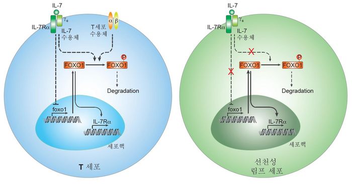 면역 세포 간 생존 경쟁이 면역계 균형 유지한다- IBS, 희소한 선천성 림프 세포가 다수 T세포와 경쟁·공생하는 관계 밝혀 - 우리 몸의 면역계에는 경쟁이 존재한다. 면역 세포들이 생존을 위해 필요한 자원은 체내에 한정적이기 때문이다. 공통된 자원을 두고 경쟁하는 면역 세포는 이들의 종류마다 우리 몸에서 차지하는 양적인 비중이 다르다. 이러한 탓에 얼핏 세포 수가 많을수록 경쟁에 유리하겠다고 생각할 수 있겠지만, 소수의 면역세포도 살아남기 위한 생존 전략을 갖고 있다. 기초과학연구원 (IBS, 원장: 김두철) 면역 미생물 공생 연구단(단장: 찰스 서 Charles D. Surh) 연구팀은 미국 라호야 알레르기·면역 연구소(La Jolla Institute for Allergy and Immunology, LJIAI), 스크립스 연구소(The Scripps Research Institute, TSRI)와 함께 희소한 면역 세포인 선천성 림프세포(Innate Lymphoid Cells, ILCs)가 면역세포 조절 단백질'인터루킨-7(이하 IL-7)'을 매우 효율적으로 소비함으로써 체내 다수를 차지하는 T세포와 자원경쟁에서 우위에 있음을 밝혔다. 이러한 특성은 T세포가 결합할 수 있는 IL-7을 제한함으로써 체내 T세포 증식을 조절한다. 선천성 림프세포는 선천면역을 담당하는 희소 면역세포로서 기생충, 장점막 내 감염 등에 대한 초기 방어, 알레르기, 항암 면역 반응 등에서 광범위한 역할을 수행하며, 암세포와 바이러스 감염세포를 공격하는 NK세포 (Natural Killer Cell)도 포함된다. T세포는 획득면역(후천면역)에서 중심역할을 수행하며, 주로 세포매개 면역반응으로 병든 세포를 처리한다. 두 세포 모두 백혈구 중 30%를 차지하는 림프세포(림프구)로 분류되지만 림프구는 획득면역 세포가 주를 이루며, 특히 T세포가 림프구의 절대다수를 차지한다. 인터루킨은 다양한 면역 세포의 발달과 분화를 돕고 면역 기능을 활성화하는 조절 단백질이다. 약 30여 종류 이상의 인터루킨 중 IL-7은 선천성 면역세포는 물론 T세포와 결합해 이들 세포의 발달과 분화를 촉진한다. 이들 면역 세포는 IL-7 수용체를 지니고 있으며 IL-7과 결합해야만 생존·증식할 수 있다. 특히 체내 IL-7이 얼마나 많이 존재하는지 여부는 항원을 만나 활성화되기 전의 T세포 그룹(Pool) 크기와 증식의 정도에 큰 영향을 미친다. 선천성 면역세포와 T세포는 생존을 위한 자원 활용 측면에서 경쟁관계에 있는 셈이다.