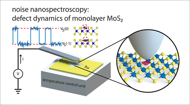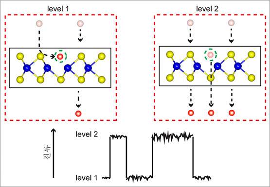 저주파 파형으로 2차원 물질 물성 밝혀- 이황화몰리브덴의 n형 반도체 성질, 원자결함에 갖힌 전자가 원인 - 과학기술정보통신부 산하 기초과학연구원(IBS, 원장 김두철) 나노구조물리 연구단(단장 이영희) 연구진은 전도성원자력현미경(Conductive Atomic Force Microscope, 이하 CAFM1))에 전류증폭기를 연결해 2차원 이황화몰리브덴(MoS2)2)의 원자결함3)과 관련한 전기적 특성을 밝혔다. CAFM이 만든 미세 전류의 저주파 파형을 읽어, 2차원 이황화몰리브덴이 반도체적 특성을 갖는 이유를 찾아냈다. 재료나 소자에 흐른 전류가 만든 ‘저주파(1Hz ~ 5kHz)’는 재료의 파괴 없이도 내부 결함을 찾는 일종의 ‘나침반’이 된다. CAFM은 원래 시료의 전도도를 측정하는 장비이다. 지름이 수십 나노미터(nm, 10억분의 1m)인 탐침으로 시료에 전류를 흘린 뒤, 전류의 크기로 전도도를 측정한다. 연구진은 전류증폭기를 사용해 CAFM이 만들어 내는 전류의 저주파 파형을 확대해 미세전류까지 측정이 가능하도록 고안했다. 같은 시료에 가해진 동일한 크기의 전류라도 내부결함에 의해 결과값이 미세하게 달라진다. 전류가 흐를 때 원자결함 내에 전자 1~2개가 갇히거나, 기존에 갇혀있던 전자가 나와 수 피코암페어(pA, 1조분의 1A) 수준의 극미세 전류차를 발생시키기 때문이다. 결국 저주파 파형을 해석하면 전자와 원자결함간의 관계를 분석할 수 있다. 연구진은 실리콘을 대체할 차세대 전자소재로 꼽히는 2차원 이황화몰리브덴을 시료로 사용했다. 전자와 원자결함을 분석해 시료 내부의 황(S) 원자결함에 전자 1개가 들어가야 안정한 상태로 존재한다는 것을 밝혔다. 이로써 2차원 이황화몰리브덴이 n형 반도체성4)을 보이는 성향이 규명되었다. 이번에 고안한 방법은 앞으로 다양한 저차원 전자소재의 전자-결함 관계를 이해하는데 유용하게 이용될 것이다. 나아가 원인이 밝혀지지 않은 재료의 특성을 이해하는 데 기여할 것으로 보인다. 이번 연구는 재료과학자, 원자력현미경 전문가, 노이즈 분석 전문가의 공동연구로 한 장소에서 연구원간 공동연구를 장려하는 IBS의 독특한 연구 환경이 빚어낸 결과이다. 이영희 연구단장은 “이번 연구성과를 활용해 나노미터 크기의 영역에서 2차원 표면의 결함을 찾고자 한다”며 새로운 노이즈 분광법 장치를 개발하는 후속연구를 진행 중이라고 밝혔다. IBS 나노구조물리 연구단 송승현, 주민규 연구위원과 마이클 노이만 연구교수가 공동제1저자로 수행한 이번 연구는 12월 14일 국제학술지 네이처 커뮤니케이션즈(Nature Communications, IF 12.124)에 게재됐다. 대외협력실 김한섭 그림설명