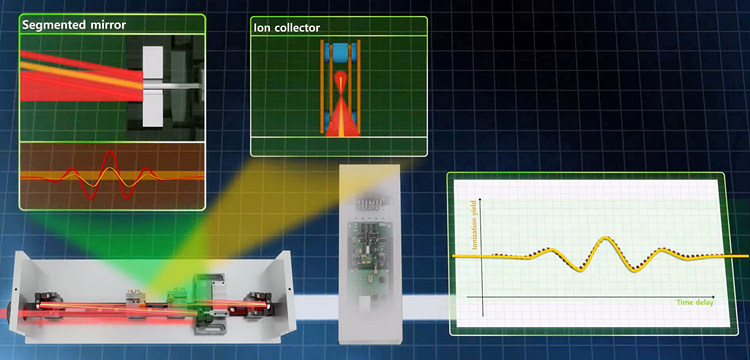 레이저 빛이 진동하는 모양 측정 성공- 극초단 레이저 펄스의 파형 측정법 팁토(TIPTOE) 개발 - 기초과학연구원(IBS, 원장 김두철) 초강력 레이저과학 연구단(단장 남창희, GIST 물리광과학과 교수)의 아토과학그룹(그룹리더 김경택, GIST 물리광과학과 교수)은 빛 입자의 전기장에 의해 원자가 이온화되는 현상을 이용, 레이저 빛의 모양을 관찰하는 데 성공했다. 공기를 매질로 이용하기 때문에 빛의 모양을 공기 중에서 측정할 수 있는 매우 실용적인 측정 방법이며, 기존의 레이저 측정법으로는 관찰할 수 없었던 매우 짧은 진동 폭의 레이저까지도 확인했다. 레이저는 전자기파의 일종으로, 전기장과 자기장이 서로 통합돼 너울거리는 모양을 띠고 있다. 전자기파가 너울거리는 진동 모양 즉 파형은 레이저 빛 자체에 대한 정보뿐만 아니라 레이저 빛이 다른 물질을 만나 상호작용하는 정보까지 포함하고 있어 레이저 공학 분야에서 이러한 파형 측정은 매우 중요하다. 빛과 물질의 상호작용 연구에는 매우 짧은 펄스(맥박처럼 짧은 시간에 생기는 진동) 폭을 지니는 극초단 레이저가 널리 이용되는데, 기존의 방법으로는 측정할 수 있는 레이저의 색상에 제한이 있거나(이차조화파 생성 현상 이용법1)) 실험 환경 조성이 까다로워(엑스선 펄스 활용법2)) 레이저 파형 측정에 한계가 있었다. 이에 따라 IBS 초강력 레이저과학 연구단 연구팀은 극초단 레이저 펄스를 두 가지 종류의 펄스 즉, 전기장이 강한 레이저 펄스와 약한 레이저 펄스로 나누어 시간차를 두고 공기 분자에 이들을 겹쳐 입사시키는 방법을 개발했다(영상1 참고). 연구진이 개발한 이 방법은 ‘전기장의 시간변화측정을 위한 터널링 이온화’(Tunneling ionization with a perturbation for the time-domain observation of an electric field) 방법 즉, ‘팁토(TIPTOE)’라 부른다. 팁토 기술의 원리는 다음과 같다. 강한 레이저 펄스와 약한 레이저 펄스로 나누어 시간차를 두어 공기분자에 극초단 레이저를 입사시키면 이 두 종류 펄스의 진동 모양이 겹쳐져 보다 강한 세기의 전기장이 형성되는 극히 짧은 찰나에(200 아토초3)), 레이저가 입사된 공기 분자에서는 전자가 분자 표면에 굴을 뚫고 밖으로 빠져나와 이온화되는 터널링 이온화 현상이 발생한다. 공기 분자에 입사시키는 레이저 펄스의 전기장 세기가 클수록 공기 분자의 이온화량도 증가해, 이온화의 변화량을 통해 극초단 레이저 펄스의 전기장 세기 변화를 측정하는 원리다.