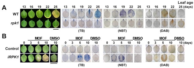 ▲ Figure 1: Aging regulation and superoxide production of Arabidopsis leaves.A)Plants without RPK1 (rpk1) show delayed aging compared with the natural plant (wt). The trypan blue (TB) dye visualizes cell death in blue, in parallel nitrobluetetrazolium (NBT) and 3,3-diaminobenzidine (DAB) stain superoxide and H2O2, respectively. These reactive oxygen species accumulate as the plant ages.