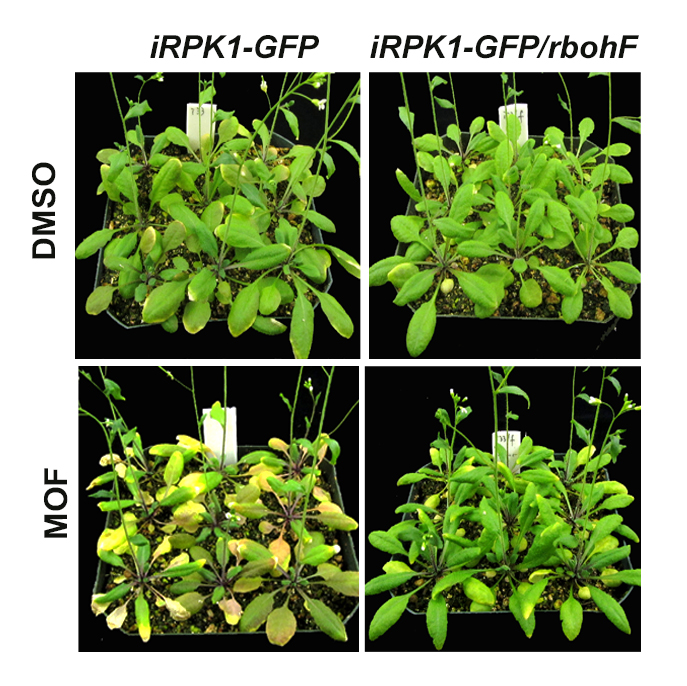 ▲ Figure 2: RbohF and RPK1 work together in plant aging.Plants engineered to have RPK1 that is activated in the presence of MOF (methoxyfenozide) turn yellow, as a sign of aging. However, when the RbohF gene is removed (right, iRPK1-GFP/rbohF) the process is slowed down.