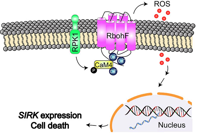▲ Figure 3: Molecular process revealed in this study.Regulation of plant senescence is mediated by reactive oxygen species (ROS), and involves a trio of proteins on the cellular membrane: Receptor Protein Kinase 1 (RPK1), calcium binding protein (CaM4) and a protein that generates ROS (RbohF). RPK1 phosphorylates CaM4, which in turn binds to RbohF to regulate ROS production. ROS produced by the protein trio are transferred into the cell and promote the expression of genes involved in senescence and cell death.