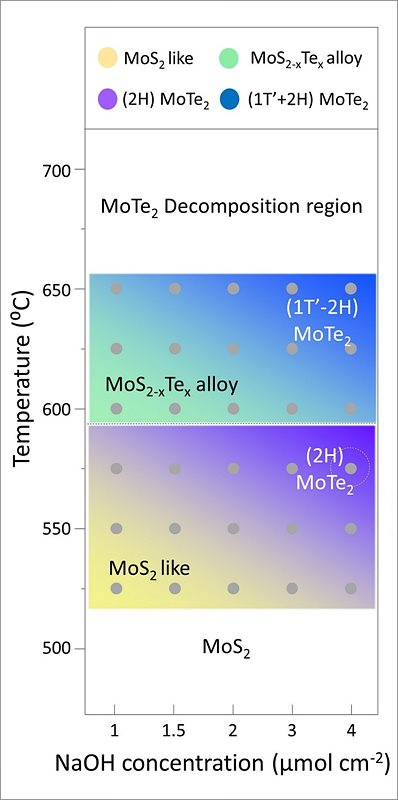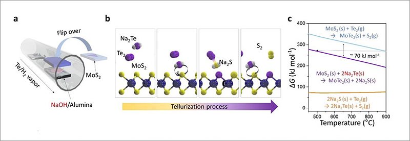 ‘Sodium-Scooter’ Delivers Tellurium to MoS2- IBS researchers use a fast and efficient catalyst to scoot tellurium in place of sulfur, Korean food delivery system is renowned to be fast and efficient. Scooters speed through the city to bring orders timely to your doorstep. Researchers from the Center for Integrated Nanostructure Physics, within the Institute for Basic Science (IBS, South Korea) have developed a low-temperature reaction, where a “chemical scooter delivery” can be used as a metaphor. A “sodium-scooter”, namely Na2Te, transports tellurium to molybdenum disulfide (MoS2) and tungsten disulfide (WS2) monolayers. With the help of the scooter, sulfur atoms were replaced with tellurium. The process occurs at 525 °C, about 300 °C lower than previously achievable. This study, published in Nature Communications, is expected to facilitate the exploration of new properties in these 2D materials. “We call it scooter, because it delivers quickly. MoTe2 molecules decompose to molybdenum and tellurium at high temperatures, but the scooter anchors telluride to MoS2 and acts as a catalyst that lowers the activation temperature of the reaction,” explains YUN Seok Joon, the first author of the study. Using this approach, the research team prepared semiconducting molybdenum ditelluride (2H-MoTe2), metallic 1T’-MoTe2, MoS2−xTex and WS2−xTex alloys. The conversion which began at the edges and grain boundaries of MoS2, was complete. 2H-MoTe2 formed near the edge and is favored at low temperatures, while 1T’-MoTe2 at high temperatures. In this method, the team could produce a diode with 2H-MoTe2 on the edge and 2H-MoS2 on the inner part. The resulting materials had different bandgap (1.1 eV), and higher degree of valley polarization (~37%) than MoS2.