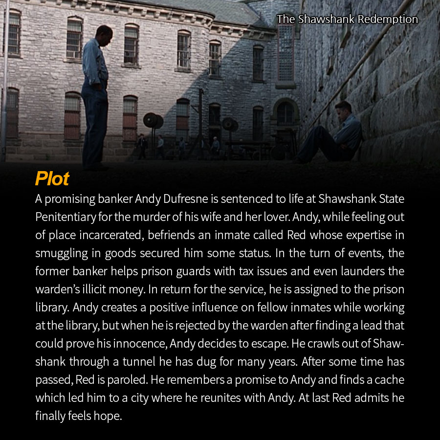 A promising banker Andy Dufresne is sentenced to life at Shawshank State Penitentiary for the murder of his wife and her lover. Andy, while feeling out of place incarcerated, befriends an inmate called Red whose expertise in smuggling in goods secured him some status. In the turn of events, the former banker helps prison guards with tax issues and even launders the warden’s illicit money. In return for the service, he is assigned to the prison library. Andy creates a positive influence on fellow inmates while working at the library, but when he is rejected by the warden after finding a lead that could prove his innocence, Andy decides to escape. He crawls out of Shawshank through a tunnel he has dug for many years. After some time has passed, Red is paroled. He remembers a promise to Andy and finds a cache which led him to a city where he reunites with Andy. At last Red admits he finally feels hope.