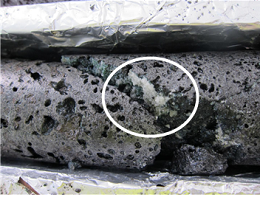 ▲ 이산화탄소가 저장된 암석 코어. 현무암 단면에 탄산칼슘 광물화가 잘 보인다. 출처: Annette K. Mortensen.