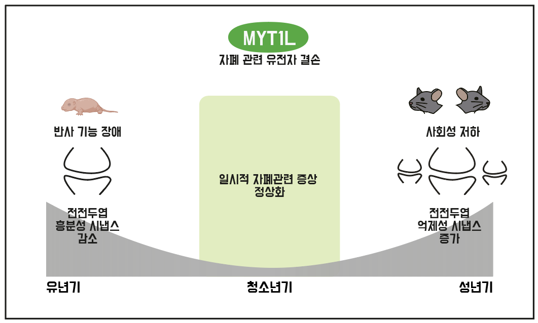 그 결과, 유년기와 청소년기, 성체기의 시냅스의 활동이 완전히 달랐다. 뇌의 변화는 유년기에 나타났다. 유년기에 살펴본 MYT1L 유전자 제거 실험쥐의 뇌 전전두엽에서 흥분성 시냅스의 수와 신호 전달이 눈에 띄게 감소했다. 시냅스는 흥분성 시냅스와 억제성 시냅스로 구분되는데, 두 시냅스의 균형이 깨지면 뇌 정신질환이 유발된다. 이후 청소년기에는 자폐 증상이 나타나지 않다가 성체시기에 다시 강하게 나타났다. 성체가 된 MYT1L 유전자 제거 실험쥐의 뇌에서는 억제성 시냅스와 신호전달이 증가했다. 즉, 유전자 이상이 유년기에 뇌 변화를 일으키기 시작하고, 오랜 기간 축적돼 있다가 성체기에 다른 메커니즘으로 자폐 증상을 유발한다는 의미다. 연구진은 “이 연구 결과는 자폐 증상이 성장 과정에 따라 어떻게 다르게 발생하는지 그 기작을 분석한 것”이라며, “치료를 위해서 유년기의 조기 진단이 중요하다는 사실을 확인한 것”이라고 설명했다. 유년기 약물 치료, 효과 있다!김은준 단장은 ‘치료 시기’에 대해서도 주목했다. 자폐 스펙트럼 장애는 대개 3세 이전에 다른 또래들과의 발달상의 차이점으로 발견된다. 우영우 변호사처럼 지능이 특별히 뛰어나거나 증상이 상대적으로 양호한 일부 아이들의 경우 7~8세가 되어서야 진단을 받기도 한다. 그런데 최근 들어 3세 이전에 진단 받아 치료하면 자폐 증상을 완화는 물론 완치도 가능하다는 의견이 제기되면서, 치료 시기의 중요성이 대두되고 있다. 이를 확인하기 위해 연구팀은 후속 연구를 진행했다. 이번에는 또 다른 자폐 유발 유전자 중 하나인 ‘ARID1B’를 제거한 실험쥐를 이용했다. ARID1B 제거 실험쥐는 MYT1L 제거 실험쥐와 마찬가지로, 사회성 저하 및 반복 행동을 보였다. ARID1B 돌연변이 실험쥐의 유전자를 분석한 결과, 유년기 시절 ARID1B 유전자가 제거되면서 뇌 전전두엽의 흥분성 시냅스 수를 감소시키는 것으로 확인됐다. 이는 청소년기와 성체 시기 쥐의 흥분성 시냅스 기능 감소로 이어졌다.