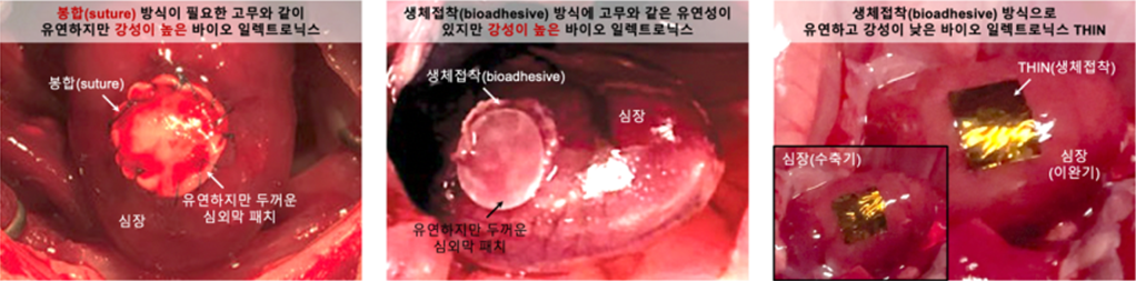 우리 몸에 ‘붙였다’는 사실조차 느껴지지 않을 만큼 얇고 부드러운 전자소자를 상상해 본 적 있나요? 몸속 장기와 피부에 부착해 신호를 읽고, 질병을 진단하며, 나아가 치료까지 수행하는 바이오 일렉트로닉스 기술이 미래 의학의 핵심으로 떠오르고 있습니다. 최근, 기초과학연구원 뇌과학 이미징 연구단에서 머리카락의 1/300 두께에 불과하면서도 건조하면 단단하고 물을 만나면 젤처럼 변신하는 ‘트랜스포머 바이오 일렉트로닉스 THIN’을 개발하며 새로운 가능성을 보고했는데요. 이번 연구의 의미와 이를 이해하기 위해 알아야 할 개념을 참여 연구진이 직접 알려드리겠습니다. 웨어러블 헬스케어란?웨어러블 헬스케어는 말 그대로 몸에 착용하거나 부착하여 건강 상태를 실시간으로 측정하고 관리하는 기술을 의미합니다. 스마트워치의 심박 측정, 패치형 혈당 센서, 피부에 붙이는 체온 패치처럼, 전자소자가 일상 속에서 우리의 생체 신호를 지속적으로 모니터링하며 건강 관리를 돕는 역할을 담당하고 있습니다. 정보통신기술(ICT)의 발전과 함께 개인 맞춤형 의료에 대한 관심이 커지면서, 웨어러블 헬스케어는 전 세계적으로 가장 빠르게 성장하는 헬스케어 분야 중 하나로 자리 잡았습니다. 사용자의 움직임과 생활 패턴 속에서도 안정적으로 작동해야 하기 때문에, 이 기술에는 휘어지고 구부러지고 늘어나는 유연한 전자소재/소자 기술이 핵심적으로 적용되고 있습니다. 한편, 웨어러블 헬스케어 기술이 발전할수록 단순히 피부 표면에서의 데이터만으로는 얻기 어려운 더 정밀하고 신뢰도 높은 생체 정보가 필요해지고 있습니다. 심장 박동의 전기적 패턴, 뇌의 미세한 전기 신호, 근육의 신경 전달 과정처럼, 병원에서만 측정할 수 있던 고해상도 생체 정보를 일상 속에서 장기간 모니터링하기 위해서는 전자소자가 생체조직에 더욱 밀착되고, 때로는 장기 표면에 직접 부착되는 형태의 새로운 기술이 요구되고 있습니다. 하지만 인체는 매우 부드럽고 끊임없이 움직이는 환경이기 때문에 기존의 딱딱한 전자소자가 이를 따르기 어려운 한계가 있습니다. 이러한 과제를 해결하기 위한 연구가 바로 차세대 소프트 바이오 일렉트로닉스 기술이며, 이는 최근 12대 국가전략 중점기술 내 세부 중점기술로 지정되어 글로벌 첨단 바이오 경쟁에서 초격차를 유지하기 위한 핵심 기술로 인정받고 있습니다. 생체조직에 바이오 일렉트로닉스를 적용하려면?최근 일론 머스크의 뉴럴링크(Neuralink)에서 뇌에 전극을 삽입해 신경 신호를 읽고 해석하는 실험을 공개하며 큰 관심을 모았습니다. 뉴럴링크와 같은 기술은 생체조직과 전자소자가 직접 맞닿아 신경 활동을 측정하거나 조절하는 바이오 일렉트로닉스의 대표적인 사례로, 의료/재활/보조공학 분야에서 새로운 가능성을 제시하고 있습니다. 이처럼 생체조직과의 직접 인터페이스를 기반으로 한 기술은 이전까지 병원 환경에서만 가능했던 고해상도 생체신호 측정을 일상으로 확장할 수 있다는 점에서 전 세계적으로 주목을 받고 있습니다. 이러한 목표를 실현하기 위해서는 생체조직에 전자소자가 얼마나 안정적으로 밀착되고, 오랜 시간 동안 기능을 유지할 수 있는지가 핵심 과제로 떠오릅니다. 인체 조직은 매우 부드럽고 끊임없이 움직일 뿐 아니라 표면이 젖어 있고 비정형적이기 때문에, 기존의 딱딱한 실리콘 기반 전자소자는 쉽게 들뜨거나 미끄러지며 신호 품질이 떨어지기 쉽습니다. 이를 극복하기 위해 새로운 접근 방식이 필요합니다. 모든 핵심 소재들을 기존의 단단한 소재에서 연하고 늘어나는 고무와 같은 소재로 대체하는 방식으로 ‘본질적인 신축성(intrinsically stretchable)’ 방식이 새롭게 제안되었습니다. 이러한 본질적 신축성 접근은 전자소자의 기계적 유연성을 크게 높여주는 장점이 있지만, 여전히 생체조직 표면과의 장기간 안정적인 적용이라는 중요한 과제를 완전히 해결하지는 못합니다. 기존 방식들은 전자소자를 인체에 고정하기 위해 실(thread)이나 스테이플과 같은 봉합(suture) 방식이나 물리적 고정 장치를 사용해야 하는 경우가 많았는데, 이는 조직 손상을 유발하고 장기간 적용 시 염증과 생체적합성 문제를 야기할 수 있습니다. 이러한 한계를 보완하기 위해 최근에는 조직 자체에 스스로 달라붙을 수 있는 ‘생체접착(bioadhesive)’ 기반 바이오 일렉트로닉스가 새로운 해법으로 주목받고 있습니다. 이러한 방식은 최근 많은 연구 개발이 이뤄지고 있으며, 대표적 개발 사례로는 2023년 미국 시카고 대학 연구팀이 국제학술지 ‘사이언스(Science)’에 보고한 본질적 신축성 기반 생체접착이 되는 반도체 소재를 활용한 바이오 일렉트로닉스 등이 있습니다. 하지만 지금까지 보고된 생체접착 기반의 본질적 신축성 바이오 일렉트로닉스는 핵심 소재 자체는 부드럽고 접착되도록 설계되었음에도 불구하고 실제 소자를 구성하기 위해서는 추가적인 기판이 필수적으로 포함되기 때문에 소재 단독으로 존재할 수 없으며, 결과적으로 전체 소자 두께가 두꺼워져 낮은 기계적 성질(modulus)에 비해 실질적인 굽힘강성(stiffness)이 크게 