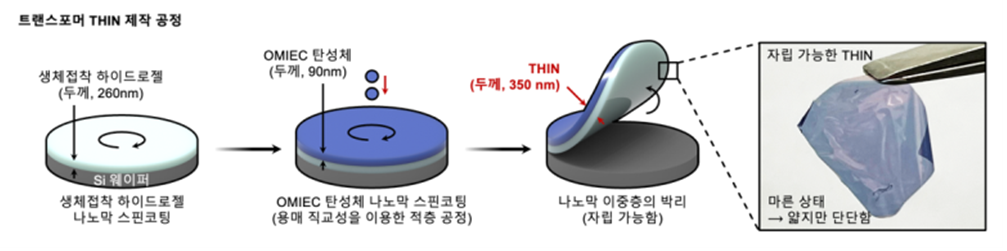 머리카락 1/300 두께의 트랜드포머 바이오 일렉트로닉스 THIN을 개발하다논문명: Hydrogel–elastomer-based conductive nanomembranes for soft bioelectronics, Nature Nanotechnology 2025 생체접착되는 본질적 신축성 바이오 일렉트로닉스의 실질적인 굽힘강성을 낮추기 위해, 필자가 속한 IBS 뇌과학이미징 연구단 연구팀은 극도로 얇아져도 손으로 다룰 수 있을 만큼 충분한 기계적 안정성(hardness)을 확보하고 동시에 높은 전달컨덕턴스(transconductance)를 유지해야 소재/소자 공정 개발에 집중했습니다. 연구팀은 생체접착층(260nm) 소재와 이온–전자 반도체층(organic mixed ionic–electronic conductor, OMIEC; 90nm) 소재를 단일 구조 안에 통합한 전체 350nm 두께의 매우 얇은 양친매성(amphiphilic) 나노막을 형성하고, 이를 각각 이온 수송을 위한 전해질층과 반도체 채널층으로 사용하는 새로운 개념의 구조인 THIN(transformable and imperceptible hydrogel–elastomer adhesive bilayer based on ionic–electronic conductive nanomembranes)기반 전기화학트랜지스터(organic electrochemical transistor, OECT) 생체신호 증폭 센서를 개발했습니다. THIN의 경우, 기존 그 어떤 바이오 일렉트로닉스와 달리 별도의 기판 없이도 취급이 가능해 수화 시 반도체 채널과 생체조직 사이의 거리를 극한(~400nm)으로 줄일 수 있으며, 이를 통해 생체신호가 채널로 전달되는 효율(transconduction)을 극대화할 수 있습니다.