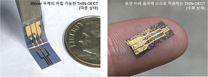 THIN 기술이 차세대 바이오 일렉트로닉스에 적용되려면?우리 연구진이 개발한 THIN 기반 바이오 일렉트로닉스는 머리카락의 1/300 두께에도 불구하고 높은 이온–전자 전달 성능을 유지하며, 수화 시 생체조직의 미세 굴곡과 움직임을 그대로 따라가는 뛰어난 기계적 적응성을 보여주었습니다. 특히 수화 시 스스로 조직에 부착되고, 기판 없이도 안정적인 취급이 가능하며, 낮은 전압에서도 고성능 증폭 특성을 구현하는 점은 기존 바이오 센서들이 해결하지 못했던 한계를 극복한 중요한 성과입니다. 특히, 이 기술은 단순히 ‘얇은 센서’를 넘어, 생체조직과 전자소자의 경계를 최소화하는 새로운 개념의 바이오 인터페이스 플랫폼으로, 개인 맞춤형 바이오 헬스케어 시대를 앞당길 수 있을 것으로 보입니다. 필자를 비롯한 연구진은 현재에도 후속 연구를 통해 기술 성숙도를 더욱 끌어올리고 있으며, 이 기술이 가까운 미래에 K-첨단 바이오의 초격차 유지에 기여할 수 있길 기대합니다.