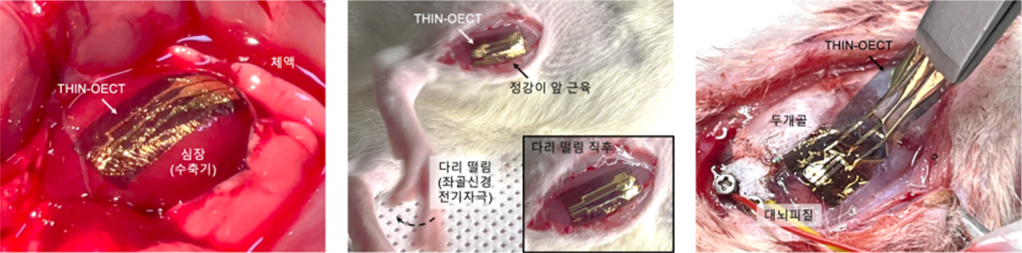 전기적 특성 측면에서도 THIN-OECT는 낮은 구동 전압(−0.6V)에서 작동하면서도 높은 전달컨덕턴스(338S·cm-1)를 유지했고, OMIEC에서 핵심 지표인 µC*(µ, 전하이동도; C*, 체적 커패시턴스) 값은 1,034F·cm-1·V-1·s-1로 지금까지 개발된 OMIEC 소재의 성능을 대폭 혁신했습니다. 해당 소재는 최대 200% 늘려도 기계적 손상이나 전기적 특성 및 증폭 성능의 저하가 발생하지 않는 등 우수한 기계적 안정성을 보여주었습니다. 또한, THIN-OECT 기반 생체신호 증폭 센서를 개발해 심전도 (epicardial electrogram, EGM), 근전도(electromyogram, EMG), 뇌피질전도(electrocorticogram, ECoG) 등 다양한 생체조직에서 고품질 전기생리학 신호를 안정적으로 증폭해 측정했고 장기간 생체적합성도 검증했습니다. 해당 결과는 나노과학/나노기술 분야 세계적인 권위지인 ‘Nature Nanotechnology (IF 35.1)’에 올해 12월에 보고됐습니다.