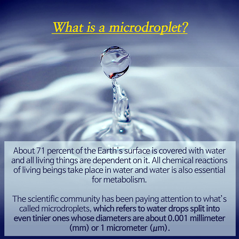 What happens when splitting water drops?About 71 percent of the Earth's surface is covered with water and all living things are dependent on it. All chemical reactions of living beings take place in water and water is also essential for metabolism. The scientific community has been paying attention to what’s called microdroplets, which refers to water drops split into even tinier ones whose diameters are about 0.001 millimeter (mm) or 1 micrometer (μm).