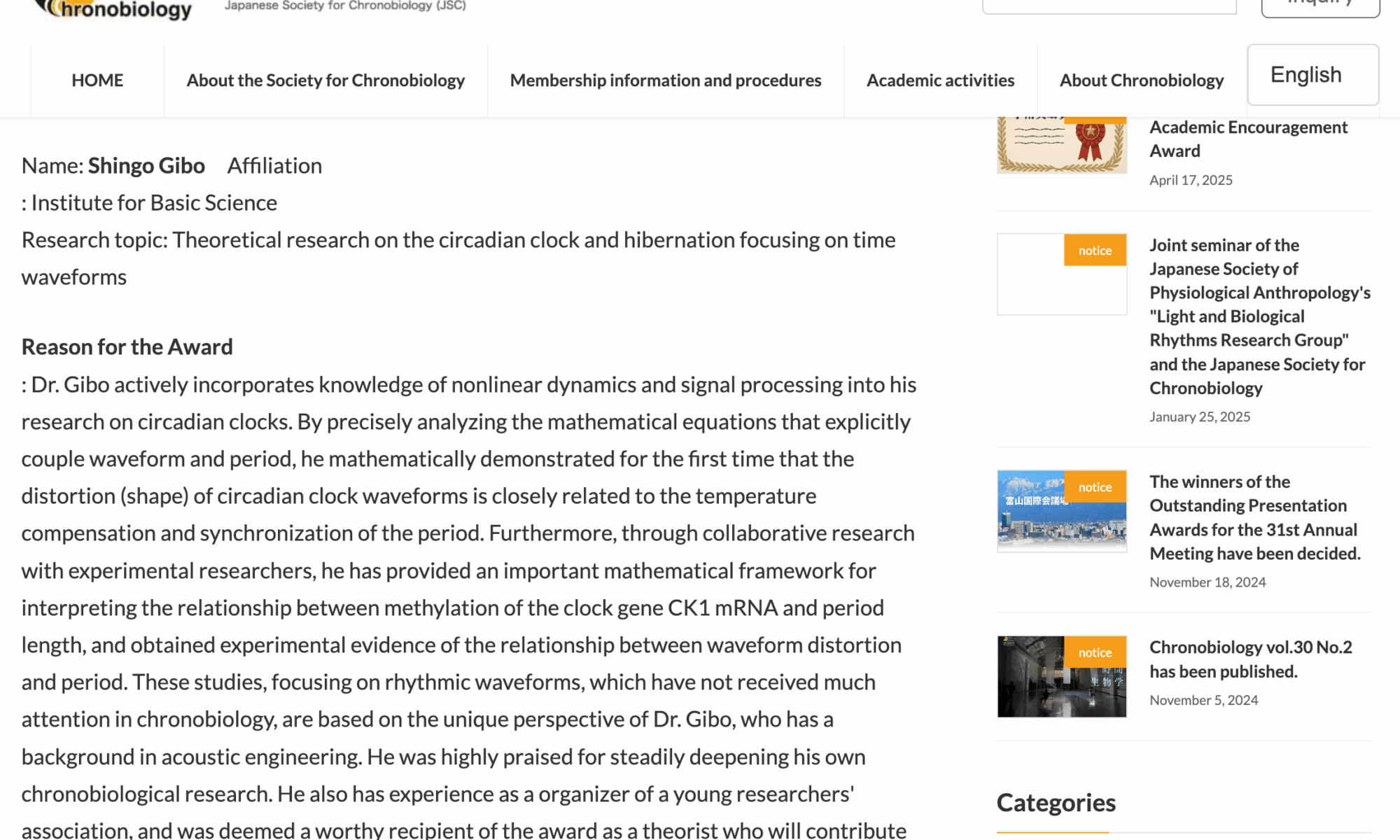 On September 24, Dr. Shingo Gibo received the Academic Encouragement Award from the Japanese Society for Chronobiology. It is the most important award for young chronobiologists in Japan. He is the first to receive it solely for theoretical work. Congrats!