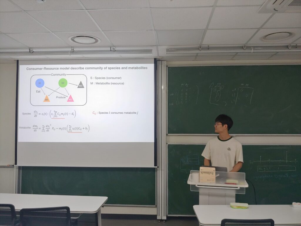 On September 9th, our student Kang Min gave a talk on the paper “Physics-constrained neural ordinary differential equation models to discover and predict microbial community dynamics” at the Journal Club.