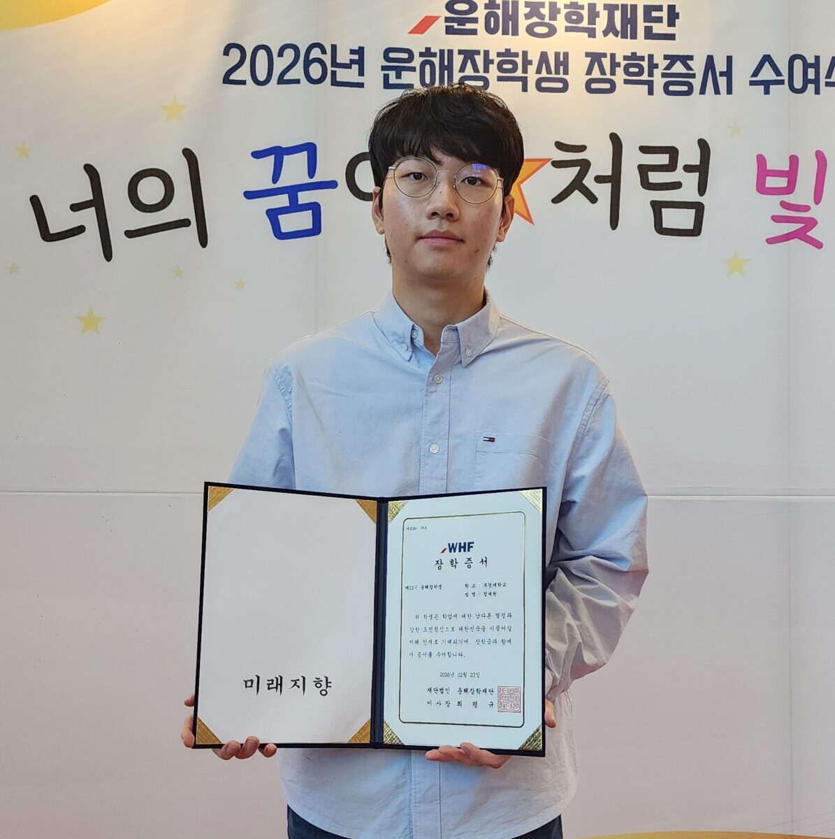On February 23, 2026, Daewon Jeong, an undergraduate intern at BIMAG, had the honor of receiving a scholarship from the Unhae Scholarship Foundation.