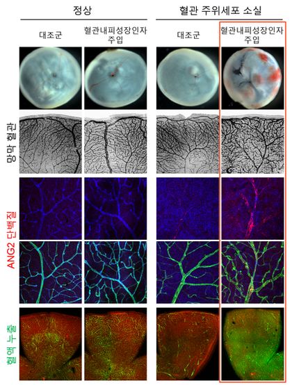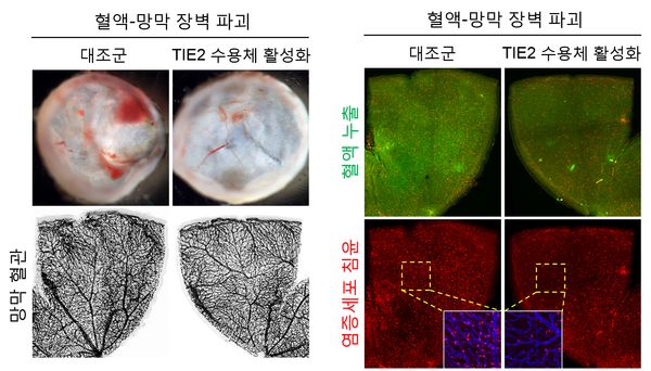 망막 혈관 주위세포 소실 '당뇨병 망막병증' 악화 원인- 혈관 연구단, 망막 혈관 주위세포 망막 내 혈관 안정화 역할 밝혀 - 기초과학연구원(IBS, 원장 김두철) 혈관 연구단 고규영 단장(KAIST 의과학대학원 특훈교수)과 박도영 박사가 망막 내 혈관 주위세포의 소실이 당뇨 망막병증1)을 악화시키는 주요 원인임을 밝혔다. 혈관 주위세포가 망막 환경에 끼치는 영향을 분석한 이번 연구는 당뇨 망막병증의 새로운 치료제 개발의 토대가 될 것으로 전망된다. 당뇨병의 3대 합병증 중 하나인 당뇨 망막병증은 성인 실명의 주된 원인으로 꼽힌다. 통증이 없고 시력이 서서히 떨어져 병변이 진행돼도 환자가 자각하는 경우가 드물다. 발병 초기 혈관 주위세포의 소실이 가장 먼저 발견되는 현상이지만 이 현상이 미세혈관에 어떤 변화를 일으키는지는 밝혀진 바가 없었다. 연구진은 당뇨 망막병증을 비롯한 다양한 망막 혈관 질환에서 혈액-망막 장벽(Blood-retinal barrier)2)의 파괴가 관찰된다는 점에 주목했다. 망막을 지키는 차단로인 혈액-망막 장벽을 조절하는 혈관 주위세포의 기능을 새롭게 밝히고, 두 관계를 규명한다면 새로운 연구결과로 이어질 것으로 예상했다. 첫 번째 실험은 정상 망막 혈관의 대조군과 혈관 주위세포가 정상적으로 유착되지 않는 망막 혈관을 지닌 실험군으로 나뉘어 진행되었다. 실험군 동물모델에서는 혈액-망막 장벽 파괴로 인해 망막 혈관의 누출, 유리체 출혈, 시각기능 상실 등 당뇨 망막병증에서 나타나는 다양한 병변이 재현되었다. 실험 결과, 연구진은 혈관 주위세포가 혈관 내피세포로부터 떨어져 나오면 혈관 안정성이 무너지면서 악순환의 고리가 형성됨을 확인했다. 먼저, 혈관 주위세포가 소실되면 혈관 안정화에 중요하다고 알려진 TIE2 수용체3) 발현이 감소한다. 이후, 혈관을 불안정하게 만드는 ANG2 단백질4)등의 발현을 촉진하는 FOXO1 인자5)의 활성이 증가하며 혈액-망막 장벽의 파괴가 점차 심해지는 것을 관찰했다. 두 번째 실험은 성체 동물모델을 대상으로 진행되었다. 안정화된 망막혈관에서 혈관주위세포를 선택적으로 소멸시켜 실험군을 만들고 혈관을 불안정하게 만드는 혈관내피성장인자(VEGF-A)6)를 주입했다. 연구진은 실험군의 망막혈관 구조가 정상처럼 보이지만 앞선 실험과 마찬가지로 혈액-망막 장벽 파괴가 촉진된다는 것을 확인했다. 망막 혈관이 혈관 주위세포가 소실되면서 정상 혈관에 비해 외부 자극에 크게 반응하는 환경으로 바뀌었기 때문이다. 연구진은 이번 연구로 혈관 주위세포가 혈액-망막 장벽을 조절할 뿐만 아니라 망막 내 혈관 안정화에 다양한 역할을 수행함을 발견했다. 망막 질환의 발병 기전이 더 자세하게 규명된 만큼 혈관 주위세포와 망막 혈관의 상호작용을 회복시키는 방법을 활용한다면 보다 근본적인 치료법이 개발될 것으로 보인다. 고규영 단장은 "이번 연구로 혈관 주위세포의 소실이 당뇨망막병증에서의 미세 혈관 및 망막 손상을 촉진시킬 수 있음을 확인했다"며 "TIE2 수용체의 활성 혹은 ANG2 단백질의 억제 등의 방법이 당뇨망막병증의 새로운 치료법이 될 수 있음을 시사했다"고 밝혔다. 이번 연구결과는 세계적 학술지인 네이처 커뮤니케이션즈 (Nature Communications, IF 11.329)7)'에 5월 16일 18시(한국시간) 게재됐다.