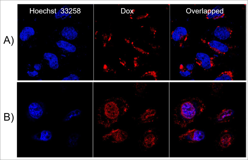 Beyond helping AO1CB[7] to self-assemble, the allyloxy tail is also light-responsive: it can react with molecules such as glutathione normally present in cells when irradiated by UV light (365 nanometer wavelength). Similarly to a soap bubble popping, the reaction between the tails and glutathione molecules breaks the AO1CB[7] vesicles apart. Rather than using UV single-photon laser to promote the glutathione-allyloxy tail reaction, IBS researchers employed a near infrared two-photon laser, which has the ability to penetrate deeper into tissues with increased accuracy. In simple terms, the two-photon laser (wavelength 720 nanometers) is a better tool to use than a single-photon laser (365 nanometers) as it can reach deeper inside flesh with less scattering. As the irradiated area is smaller, the drug delivery is confined to the targeted area, resulting in less damage to healthy tissue surrounding the tumor. The research team applied this technology to deliver the chemotherapeutic drug Doxorubicin to cervical cancer cells (HeLa cells) in the laboratory. They observed that the drug was able to exit the vesicles, reach the nucleus of the cancer cells, and eventually kill them.