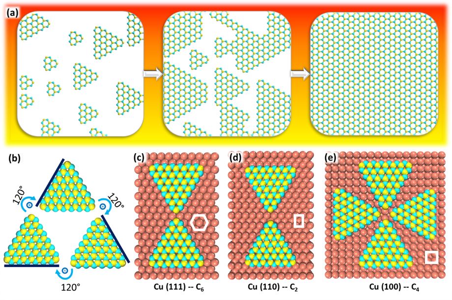 ▲ Figure 2. Epitaxial growth of single crystal hBN on a substrate. The hBN islands in (a) are unidirectional. In (b) the 3-fold symmetrical hBN shows 3 times of coincidences during the rotation form 0-360°. hBN has a 3-fold symmetry because the lattice of hBN will not be changed by rotating it by 360°/3 = 120°. (c-e) The equivalent alignments of hBN on copper surfaces (c-e), namely Cu(111), Cu(110) and Cu(100). The top layer atoms of (c),(d) and (e) show equivalent hBN alignments on substrates with 6-, 2-, 4-fold symmetries, respectively. The white shapes show the geometrical characteristic of the substrates, from which the symmetries of the substrates can be seen.