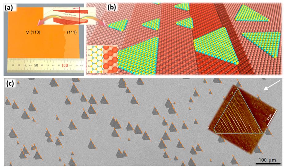 ▲ Figure 4. (a) large area single-crystal copper foil with a low symmetric surface, a vicinal surface of Cu(110) orientation, namely V-(110). (b) the growth of large number of unidirectional aligned hBN islands on the vicinal Cu(110) surface. (c) SEM and AFM images of hBN islands on vicinal Cu (110).