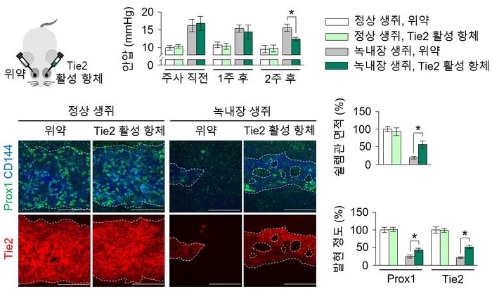 연구진은 녹내장이 유발된 상황에서 ANG-TIE2 신호전달체계의 활성화가 어떤 효과가 있는지 추가 실험을 진행했다. TIE2 수용체를 활성화하는 실험적 항체(ABTAA)가 쉴렘관의 내피세포에 작용하여 방수 유출을 증가시키고 안압을 낮출 수 있는지가 관건이었다. 쉴렘관이 망가져 안압 상승으로 녹내장이 유발된 실험군의 눈 속에 항체를 투여한 결과, 쉴렘관이 회복되면서 안압이 내려가는 것을 확인했다. 쉴렘관 항상성 저해가 녹내장의 발생과 밀접한 연관이 있음을 밝힌 것이다.