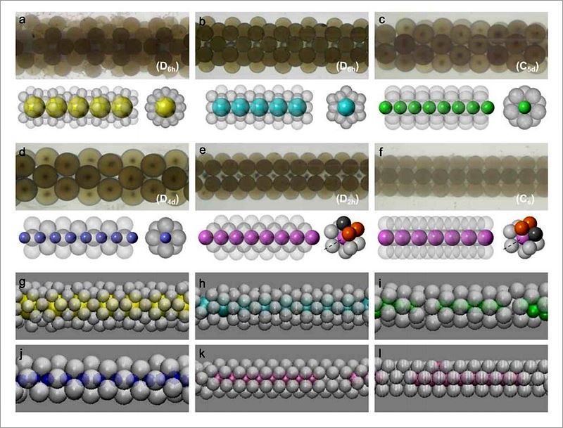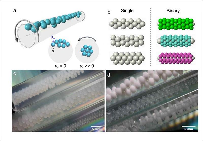 입자들의 농도를 달리해 실험을 진행한 결과, 5가지 종류의 구조를 얻을 수 있었다. 회전 가속도에 따라 한 구조에서 다른 구조로 변경 가능하고, 원통을 기울이면 나선 방향의 구조를 조절할 수 있다. 부력으로 인해 위쪽에 모여 있던 입자들이 아래로만 뻗어 나가면서 나선이 생기기 때문이다. 연구진은 더 나아가 2종류의 입자로 구성된 원통형 구조를 만들었다. 가벼운 입자가 중심축으로, 무거운 입자가 바깥으로 몰리는 것을 이용해 기존에는 구현할 수 없었던 구조를 동적 자기조립 방식으로 구현한 것이다.