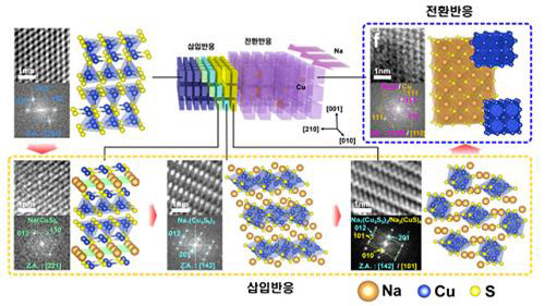 리튬 이온 전지의 대안으로 주목받는 것이 바로 나트륨 이온 전지다. 나트륨은 지구 지표면에 2.6% 존재한다. 리튬의 약 500배 이상이다. 자연스레 공급문제도 해결될 것으로 보인다. 가격을 비교하면 리튬 이온 전지에 비해 약 40% 저렴한 가격으로 같은 용량의 에너지를 저장할 수 있을 것으로 예측된다. 나트륨을 이온 전지로 활용하기 위해서는 해결해야 할 문제가 있다. 리튬 이온 전지의 음극 재료인 흑연이 나트륨을 저장하기에는 적합하지 않기 때문이다. 리튬의 경우, 음극 재료인 흑연 간 층 사이에 껴 들어가 저장이 가능하다. 하지만 나트륨 이온이 흑연 층 사이로 삽입되기엔 층간 거리가 너무 좁다. 이러한 이유로 나트륨 이온 전지 상용화를 위해서는 이에 적합한 음극 소재 개발이 필요하다. 연구진은 흑연의 대안을 황화구리에서 찾았다. 나노판상 구조를 가진 황화구리는 높은 전기전도도와 이론용량(이론상 가능한 최대용량)을 갖는다. 연구진은 황화구리에 나트륨이 저장되는 과정을 원자단위에서 실시한 분석한 결과, 황화구리의 결정 구조가 유동적으로 변화하며 안정적으로 나트륨 이온을 저장하는 것을 확인했다. 황화구리의 나트륨 저장 성능은 흑연 이론용량(~370mAh/g)의 1.5배(~560mAh/g)에 달했으며, 충·방전을 250회 반복한 이후에도 이론용량의 90% 이상이 유지되었다.