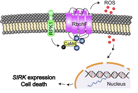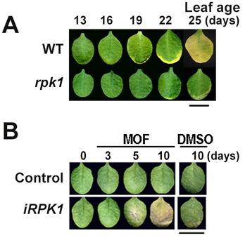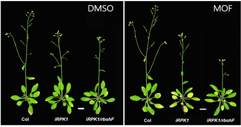 식물 노화의 주범 활성산소, 노화 조절 작용 밝혔다- IBS, 세 종류 단백질 결합해 활성산소 증가하면 식물 노화 촉진 - 활성산소1)는 사람의 노화와 질병의 주요 원인 중 하나다. 인간뿐만 아니라 식물의 노화에도 관여하는 것으로 알려져 있다. 활성산소는 세포에 손상을 입히는 모든 종류의 변형된 산소를 말한다. IBS 식물 노화․수명 연구단 연구팀은 애기장대 모델 식물을 이용해 잎의 노화 과정을 조절하는 활성산소의 발생 메커니즘을 밝히는데 성공했다. 이번 연구를 통해 활성산소를 발생시키는 분자 수준의 정확한 이해를 넓혀줄 것으로 기대된다. 활성산소는 식물이 태양으로부터 빛을 흡수해 에너지를 만드는 과정에서 부산물로 생성된다. 활성산소의 양이 증가하면, 식물의 성장과 건강 기능 유지에 필요한 유전자나 단백질의 기능이 저해되고, 정상 세포가 죽기도 한다(세포사멸). 결과적으로 식물의 노화가 촉진되는 것이다. 그러나 활성산소의 생성이 구체적으로 어떻게 노화에 영향을 미치는지 분자 수준에서의 메커니즘은 밝혀진 바가 없었다. IBS 연구진은 애기장대 잎이 시간이 지남에 따라 자연적으로 노화될 때 세포막 단백질 RPK1 유전자 발현이 증가하는 것에 주목했다. 연구진은 RPK1의 기능을 연구한 결과, RPK1 단백질이 활성산소의 생성을 조절해 노화에 영향을 미친다는 사실을 발견했다. 이에 따라 RPK1 유전자 발현 정도를 증가시키면, 활성 산소의 생성이 증가하고 식물 세포가 죽어 잎이 노랗게 변하는(Yellowing) 노화현상이 촉진됨을 확인했다. 구체적으로 연구진은 실험 과정에서 RPK1에 의한 활성산소 조절에는 활성산소 생성 효소인 RbohF가 관여함을 발견했다. RbohF 유전자가 망가진 형질전환 식물에서는 RPK1이 작용해도 식물의 노화가 촉진되지 않았던 것이다. 그러나 이 두 단백질은 직접 결합하지 않는데, 연구진은 칼슘결합 단백질인 CaM4가 이 두 단백질의 연결고리임을 밝혔다. 즉 RPK1이 CaM4 단백질을 인산화하고, 인산화된 CaM4가 다시 RbohF에 결합해 활성산소가 생성되도록 하는 것이다. 이렇게 생성된 활성산소는 세포 내로 전달돼 세포 사멸과 노화에 관련된 유전자들의 발현을 유도하게 된다. 세 가지 단백질 RPK1-CaM4-RbohF 이 칼슘 결합 단백질 CaM4를 연결고리로 하여 트리오가 작용할 때, 활성산소가 생성되어 노화가 진행되는 것이다. 이번 연구는 분자 수준에서 활성산소와 식물 노화와의 관계를 밝혔다는 점에서 노화 연구에 크게 기여할 것으로 기대된다. 활성산소에 대한 식물의 복잡한 대응 전략 중 세포 사멸로 이르는 메커니즘을 명확히 규명한 데 의의가 있다. RPK1은 노화 뿐 아니라 추위나 가뭄 등 식물이 받을 수 있는 다양한 스트레스 신호전달 과정에도 관여하는 것으로 알려져 있어 이번 연구가 향후 식물의 스트레스 및 노화 연구에 기폭제가 될 것으로 보인다. 본 연구결과는 셀 리포트(Cell Reports, IF=8.282)에 미국시간으로 12월 12일자에 게재됐다. 그림설명