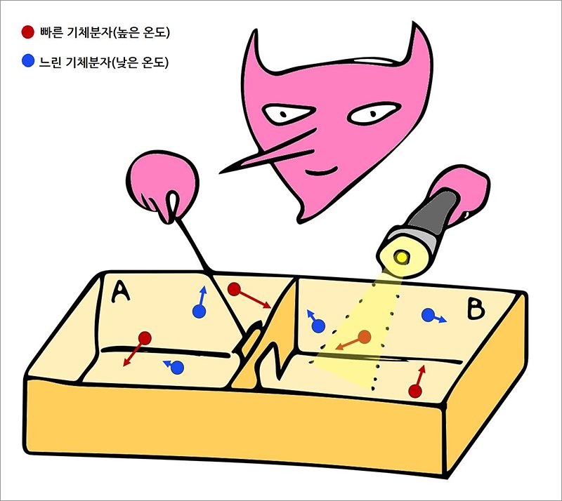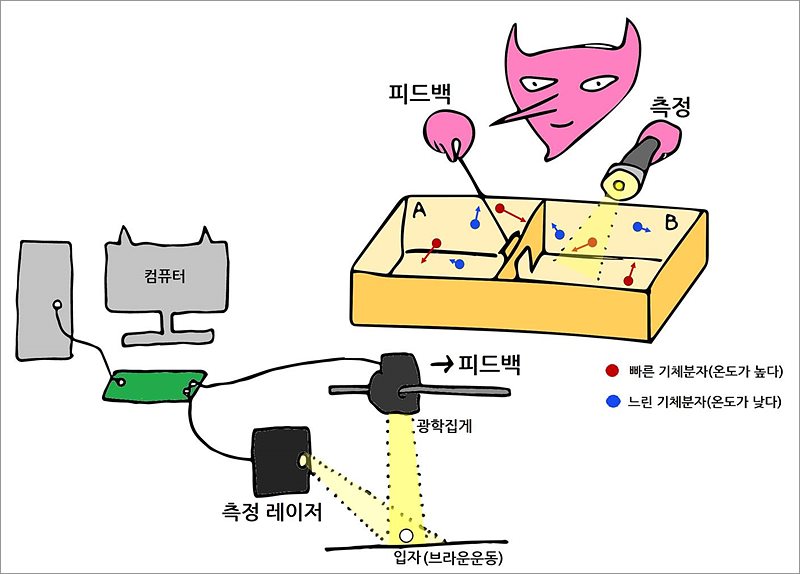 효율 100% 정보 엔진 구현 성공- 열역학 제2법칙의 이론적 한계점 도달…맥스웰의 도깨비, 이론과 실험 모두 증명 - 우리원 첨단연성물질 연구단 박혁규 연구위원이 이끄는 연구진이 효율 100% 정보 엔진을 구현했다. ‘정보를 일로 전환한다’는 새로운 틀에서 완전한 효율을 달성한 것은 이번이 처음이다. 손실 없는 엔진을 구현해 이론적으로 가능한 최대한의 일을 뽑아낼 수 있다는 의미다. 정보 엔진은 ‘맥스웰의 도깨비’라는 물리학 개념에서 출발했다. 맥스웰의 도깨비는 열역학 제2법칙인 ‘엔트로피(Entropy)1)는 감소하지 않는다’를 시험하기 위해 맥스웰이 고안한 사고실험이다. 어떤 가상의 존재(도깨비)가 온도가 같은 두 방 사이에 앉아, 두 방문 사이에 오가는 기체 분자의 위치와 속도를 측정다고 가정한다. 이 도깨비는 문을 향해 다가오는 분자가 빠른지 느린지에 따라 문을 여닫는다. 이를 반복해 빠른 기체분자와 느린 분자를 각각 다른 방에 모으면 두 방의 온도가 달라지고 결국 엔트로피가 감소한다.