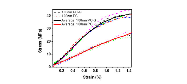 먼저 연구진은 그래핀 옥사이드(Graphene Oxide)4)에 인장시험을 시도하였다. 그 결과 기존에 불가능했던 35㎚두께의 초박막 그래핀 옥사이드 시료를 센티미터 크기(1㎠)의 기판에 전사하는데 성공하였다. 그리고 인장하중과 인장탄성률, 인장강도를 측정하게 할 수 있었다. 이는 이전에 학계에 보고된 2㎛ 두께보다 훨씬 더 얇은 그래핀 옥사이드 시료의 기계적 특성의 측정이다. 이후 이 방법을 화학기상증착법(CVD)5)으로 만든 단층 그래핀(다결정 그래핀, 단결정 그래핀에 가까운 고배향성 그래핀)에 적용시켜 보았다. 연구진은 CVD방법으로 성장시킨 그래핀을 100㎚의 폴리카보네이트 필름에 전사하여 결과를 확인했다. 먼저 다결정 그래핀6)을 폴리카보네이트에 전사하여 인장시험을 시도한 결과, 637~793GPa의 영률7)을 측정하는데 성공하였다. 그리고 단결정 그래핀8)에 가까운 고배향성 그래핀9)을 폴리카보네이트에 전사하여 기계적 특성을 시험하였다. 측정결과 접힌부분이 수직방향일 경우 683~775GPa, 접힌부분이 수평방향일 경우 725~905GPa의 영률을 측정하는데 성공하였다. 이는 최초로 단층 그래핀 필름의 인장을 측정한 것이다.