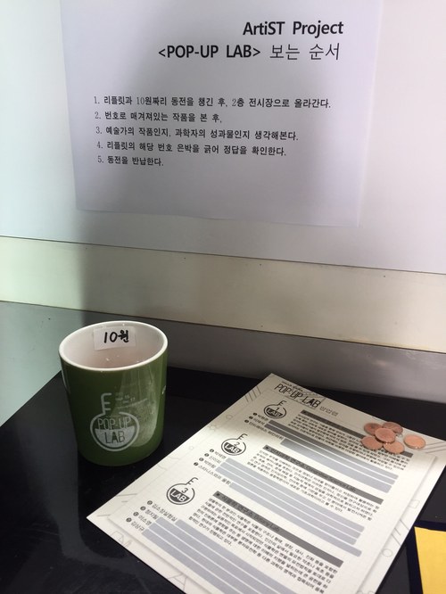 이번 전시는 창작센터를 방문하는 관람객의 참여를 유도하는 형태다. 관람객들은 작품의 정보가 가려진 안내도를 받은 뒤 작품을 감상한다. 감상 후 자신의 경험과 감각을 최대한 끌어 모아 누구의 작품인지 맞추는 형식이다. 관람객은 과학기술을 차용하는 예술가의 작품과 아름답고 독특한 과학적 결과물 사이에서 의문을 갖고 전시장을 나서는 것이다. 대전시립미술관 이상봉 관장은 "전시는 과학자와 예술가의 단순한 융합을 보여주기 보단 관람객이 스스로 과학과 예술의 흐름을 읽을 수 있도록 구성되어 있다"고 전시 의도를 설명했다. 15일 전시회 개막식에 참석한 김상규 연구위원은 작가들과 함께 모인 자리에서 "과학자는 우리가 아직 알지 못하는 것을 찾아 다닌다. 운이 좋아 자연의 신비를 일부 발견해 세상에 알리면 우리의 발견은 옛 것이 되고, 과학자는 또 다른 새로운 것을 찾아 떠난다"며 "나에게 팝업랩은 소수의 전문가만이 기억하는 나의 '옛 것'을 하나의 미술 작품으로 다시 읽어 주는 사람들과 만나는 자리다"고 참여 소감을 밝혔다.