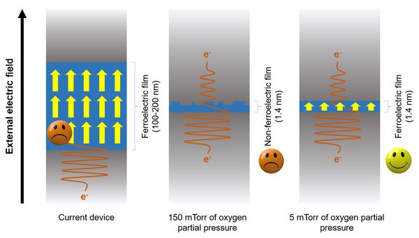 Building functional ferroelectric capacitors of the right thickness has been a difficult task. Even when the ferroelectric layer was thin enough, adding the top electrode caused the device to lose its ferroelectricity. IBS scientists noted that this is caused by irregularities in the interface between the top electrode and the BaTiO3 layer. "We thought that heterogeneous interfaces could cause problems and we worked to make them uniform," explains SHIN Yeong Jae, first author of the study. This non-uniformity at the interface does not have a great effect when the thickness of the device is large, but it affects the stability of such thin devices In this study, IBS scientists have proposed a method for solving this interface non-uniformity problem. During the standard ferroelectric capacitor manufacturing technique, oxygen gas is injected at a high pressure. They found that reducing oxygen pressure helps to keep the interface uniform. "High oxygen partial pressure of 150 mTorr is usually used, because it is a common belief that it is better to add a lot of oxygen to prevent oxygen vacancies, which are molecules missing oxygen atoms," continues Shin. "This is true, but we found that 5 mTorr is a good compromise to achieve homogeneous interface without oxygen vacancies."