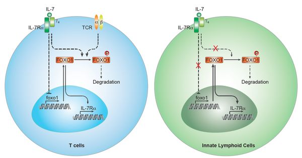 Competition for Survival Signals Maintains Immune Balance- Although scarce, the recently discovered innate lymphoid cells vie with T cells for a shared source of interleukin-7, which helps them to survive. These findings could deepen our understanding of immune memory in vaccine and aging - According to a new study published in the journal Immunity, two types of immune cells compete for a shared source of proteins that allow them to survive. The "contestants" are the recently discovered and ultra-rare innate lymphoid cells (ILCs) and the abundant T cells: ILCs are more effective. Director of the Academy of Immunology and Microbiology (AIM) in Institute for Basic Science (IBS), Charles D. Surh, led this international effort with researchers from La Jolla Institute for Allergy and Immunology and The Scripps Research Institute. These findings could promote our understanding of immune memory in vaccines and aging. The study of the immune system has produced many life-saving discoveries, the greatest of which is arguably the concept of immunization and immunological memory. Vaccines protect us by providing specific stimulation of immune cells populations; B and T cells. The ingredients of vaccines are relatively short-lived, but the protective effects of the vaccine can last for many decades because of a complex phenomenon, called homeostasis, that support the upkeep of a constant reservoir of immune cells. The homeostatic survival of B and T cells is not only important after vaccination, but also in old age when production of B and T cells slows and we are heavily reliant on the long-term survival of immune cells we created when we were young. In order to survive, these immune cells need to bind to a protein called interleukin-7 (IL-7) via the IL-7 receptor (IL-7R) lying on their surface. However, it is unclear how the body regulates the amount of IL-7 made available. The question was compounded by the difficulty of measuring IL-7 levels in vivo: traditional methods of immunohistochemistry or immunofluorescence were woefully inadequate to even detect, let alone quantify, IL-7 in laboratory mouse tissue. The first breakthrough of this study was made possible due to the expertise cultivated in Surh's lab over several decades in characterizing the homeostatic T cell proliferation in mice. Their scientists used mice lacking the IL-7R so that IL-7 could accumulate to supraphysiogical levels, sufficient to drive T cell homeostatic proliferation. Then, the group replaced various IL-7R-expressing cell types and monitored for a return of IL-7 homeostasis. The results clearly indicated that T cells were not the only consumers of IL-7, ILCs do it too. ILCs are a recently discovered class of immune cells that have been shown to be involved in the resistance to pathogens, tissue remodeling, and immune disorders. "To be honest, I was quite surprised that ILCs have such an effect in this model," said lead author, Christopher Martin. "Relative to T cells, there are very few ILCs in the tissues we study. So, when we were designing the initial experiments, we weren't optimistic that we would find anything interesting." The second pivotal set of discoveries were made possible by the facilities and expertise unique to the Academy of Immunology and Microbiology in South Korea. The state-of-the-art germ-free mouse research facility allowed the team to show that ILCs compete for IL-7 independent of commensal bacteria. Finally, work led by the young investigator KIM Kwang Soon demonstrated the molecular mechanism that explains why the ultra-rare ILCs are more effective than the abundant T cells in consuming IL-7. This is possible because T cells decrease the number of IL-7Rs after binding IL-7, while ILCs do not. "The findings are not only of interest to the esoteric field of immune homeostasis, but also to the broad biological community because they are a stark reminder that life exists as a complex concert and not as a collection of various types of cells that merely just co-exist," concludes Charles D. Surh. The biological significance of this competition for a shared source of survival stimuli, remains to be explained.