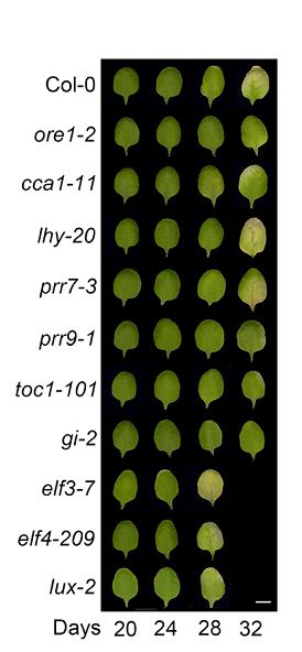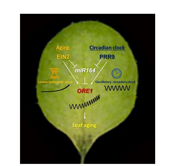 A Conversation between Plants’ Daily and Aging Clocks- Plants’ daily clock and leaf yellowing are intimately interwoven as the 24-hour cyclic rhythm and aging in animals - Every day you get a day older. So do plants. While the biological daily clock ticks, time passes also for the aging clock. Scientists at the Center for Plant Aging Research, within the Institute for Basic Science (IBS), have found out how the two clocks talk to each other genetically. Plants’ circadian clock - the 24-hour cyclic rhythm - plays a critical role in regulating aging, in particular in timing the yellowing of the leaves. As aging plants recycle nutrients for the new leaves and seeds, uncovering these timekeeping mechanisms is important to understand plant productivity. Most organisms are influenced by the daily and annual cycle of light and temperature. The circadian clock functions as a “mastermind” to align many aspects of development and physiology with certain times of the year or the day. In plants, the main gears of the daily clock are nine genes which have a peak in their biological activity either in the morning (morning complex) or in the early evening (evening complex). They work as a network and regulate plants’ growth and flowering. In this study published in PNAS, IBS researchers used plants deficient in one of these nine core circadian clock components at a time to study the effect on the aging clock. In animals, the two biological clocks are interlinked; it was found that mutations in clock genes accelerate aging, and aging alters the circadian rhythmicity. However, the relationship between the aging and circadian clocks in plants has not been clarified yet. IBS researchers have used the model plant Arabidopsis thaliana and determined that some daily clock genes are directly or indirectly related to aging. To identify clock components directly involved in aging, the team examined the timing of leaf yellowing over time and in the dark, as darkness makes Arabidopsis age faster. Plants lacking three components (elf3, elf4, and lux) of the evening complex had yellow leaves sooner, whereas plants without the morning component PRR9 (PSEUDO-RESPONSE REGULATORS 9) remained green for longer showing delayed aging, in both age-dependent and dark-induced conditions. Then, the researchers found that PRR9 plays an important role in the expression of a key gene for plant senescence, known as ORE1. In this way, the two clocks interact with each other.