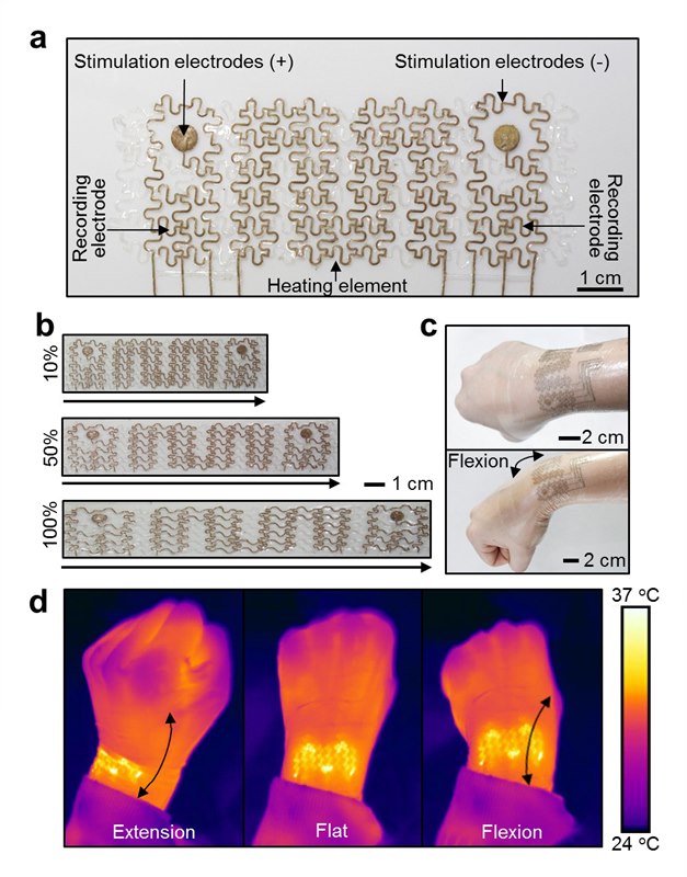 IBS researchers have used this new device on human skin to record the electrical activity of heart and muscles, that is electrocardiogram (ECG) and electromyogram (EMG) respectively. Thanks to its softness, elasticity and stretchability, it can follow the contours of flexible joints, such as the wrist. Worn on a forearm, it simultaneously monitored EMG signals, and delivered electrical and/or thermal stimulations that could be employed in therapeutic applications.