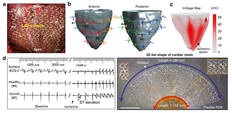 The research team has also produced a customized large mesh that fits the lower part of a swine heart. Wrapped around the heart, the implant can read signals from the entire organ to identify possible lesions and help recovery. For example, it was able to register the change of ECG signal caused by an acute heart attack. The mesh is stable during repetitive heart movements and does not interfere with the heart’s pumping activity.