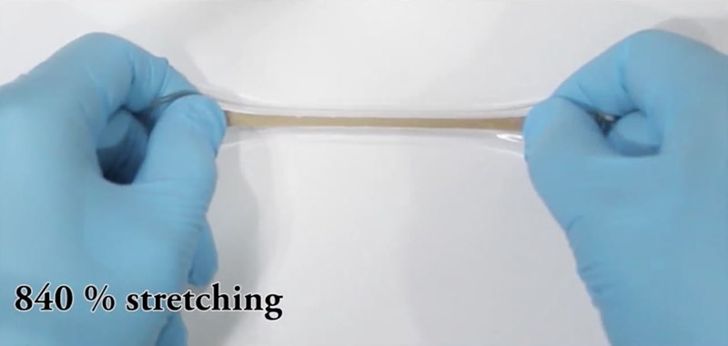 Video 1: Stretchability features of the gold-coated silver nanowires. IBS researchers found the optimum composition of: gold-coated silver nanowires, a rubber called polystyrene-butadiene-styrene (SBS) and hexylamine, that maximizes biocompatibility, while maintaining high conductivity of approximately 41,850 S/cm and maximum stretchability of 840%.