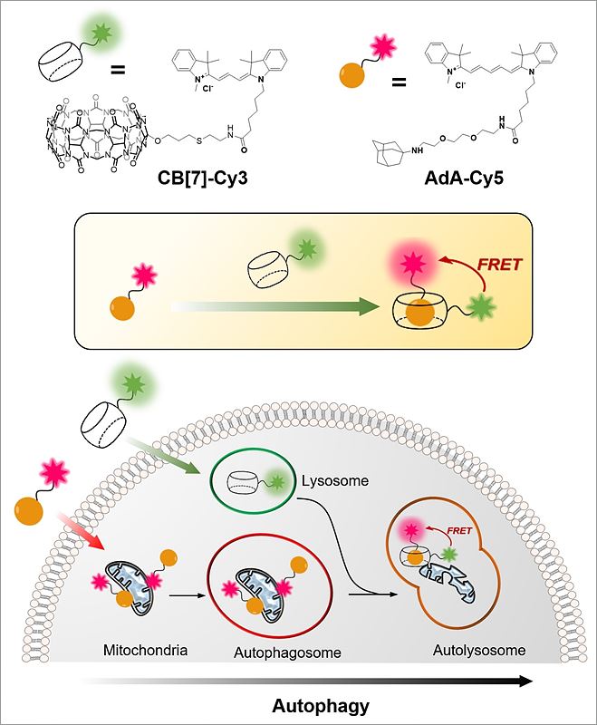"The most challenging part of the experiment was the choice of the chemicals. We chose chemicals with the right hydrophilicity, charge, and molecular size to be selectively incorporated into mitochondria and lysosomes," explains PARK Kyeng Min, one of the corresponding authors of the study. In more technical terms, the novelty of this paper relies on the application of fluorescence resonance energy transfer (FRET) to the study of autophagy. FRET is a distance-dependent transfer of energy between two different fluorescent dyes; in this case Cy3 and Cy5. When the two are close enough, Cy3 donates energy to Cy5. The scientists capture the meeting of the two dyes as the transfer of energy from Cy3 to Cy5 leads to a reduction in Cy3 fluorescence intensity in favor of an increase in Cy5 emission intensity.