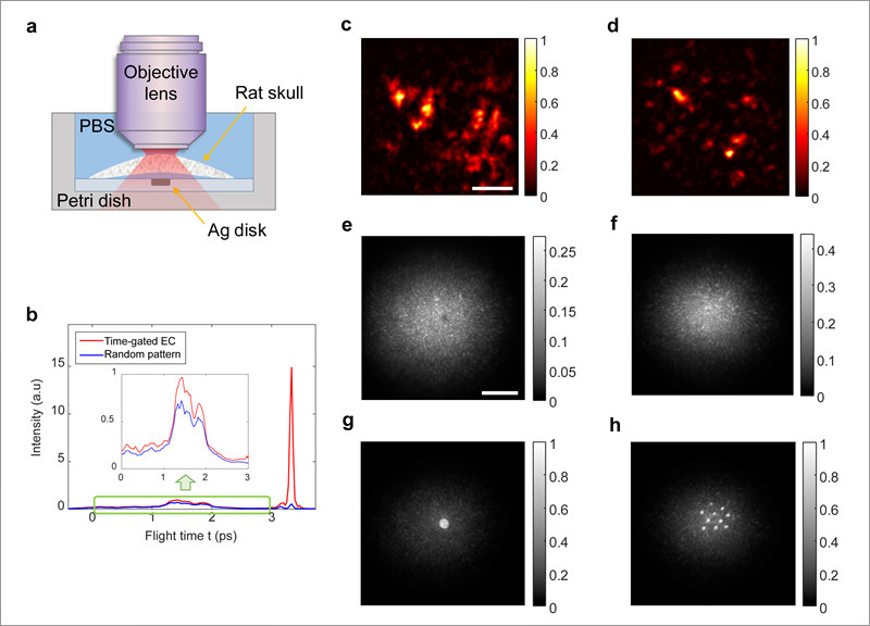 After having verified that theoretical predictions and experiments matched, IBS scientists applied the technique to a 340 μm-thick young mouse skull. They placed either one or ten silver disks below the skull as targets, and immersed them in a biological serum that simulates conditions of living tissue. The new technique, which registers only the waves that reached the target, worked better than collective accumulation of single scattering (CASS) microscopy.