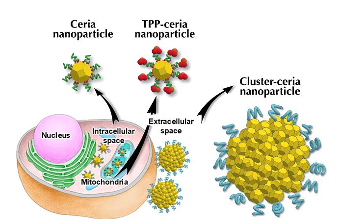 New Ceria Nanoparticles Attack Parkinson’s Disease from Three Fronts- By removing reactive oxygen molecules, ceria nanoparticles reduce signs of Parkinson’s disease in mouse neurons - Researchers at the Center for Nanoparticle Research, within the Institute for Basic Science (IBS, South Korea), have developed a set of nanoparticles for Parkinson’s disease treatment. Tested in mice and published in Angewandte Chemie as a “hot paper”, this study represents the first biomedical application of nanoparticles in the clearance of reactive oxygen by-products in Parkinson’s, and gives new hints of therapeutic targets. In the future, the system is expected to be used in the identification and treatment of other pathologies caused by reactive oxygen species, including: cancers, cardiovascular diseases, neurodegenerative diseases, and sepsis. Parkinson's disease is characterized by the sudden degeneration and death of neurons that secrete dopamine in the brain. Accumulation of reactive oxygen species damages the neurons, by contributing to the onset of mitochondrial dysfunction, neuroinflammation, and neuronal death. The brain’s low antioxidant levels and abundance of lipids, make it more vulnerable to the side effects of reactive oxygen species, including free radicals. The oxidative stress caused by these molecules inside mitochondria, together with neuroinflammation due to intracellular and extracellular oxidative stress are considered important causes of Parkinson's disease. Until now, there has been no technique to selectively clear reactive oxygen species, nor to distinguish their effect according to their cellular localization. To solve these problems, IBS nanoparticle researchers have devised three types of ceria nanoparticles with different sizes and surface properties, capable of selectively removing reactive oxygen species from mitochondria, intracellular, and extracellular spaces. Ceria nanoparticles aimed at the intracellular spaces have a size of 11 nm, which is small enough to enter the cell, and a negative surface charge (ζ-potential: -23 mV) which prevents them from entering the mitochondria membrane. The ceria nanoparticle targeting oxygen free radicals in mitochondria are decorated with triphenylphosphonium (TPP), which confers them a positive surface charge of +45 mV. Finally, nanoparticle clusters of hundreds of thousands of 3 nm ceria nanoparticles with a size of 400 nm and a negative surface charge, are capable of removing reactive oxygen species while remaining outside the cell.